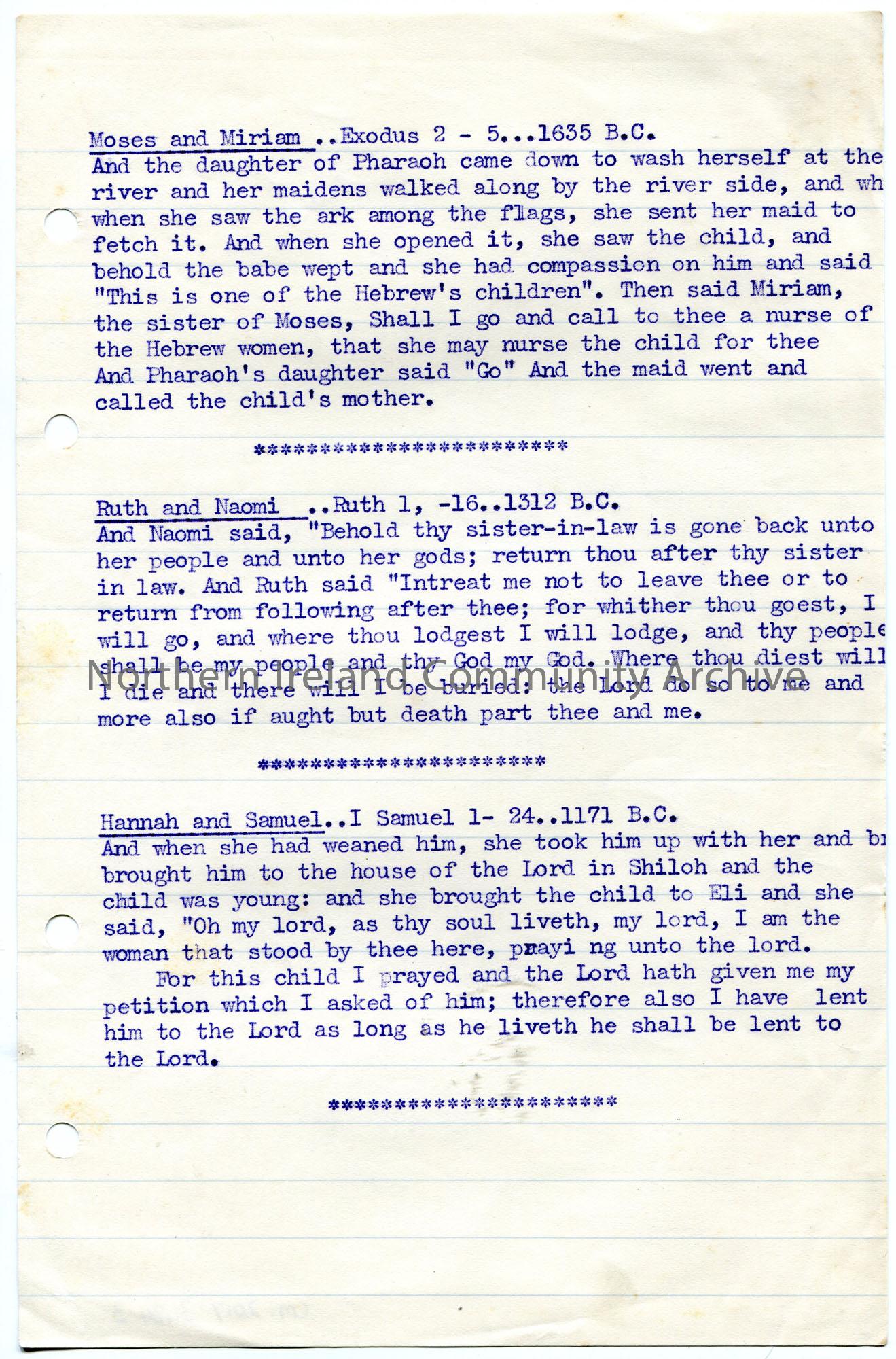 Page 3 of 5. Typed notes on lined paper for a Bible Class addressed to women. Talk is about women in Biblical times. Mentions Moses and Miriam, Ruth and Naomi and Hannah and Samuel.