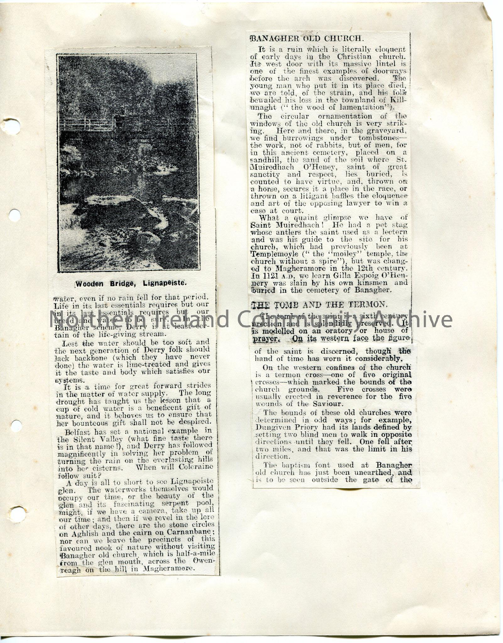 Page 3 of 6. Newspaper cutting, stuck to paper, from the Northern Constitution. No date. Text and photographic images. Titled, 'In Banagher Glen. The Serpent Pool. Ancient Days and Modern Ways'. Mentions the Altnaheglish dam, Lignapeiste glen, Banagher Old Church and the tomb of Saint Muiredhach O'Heney