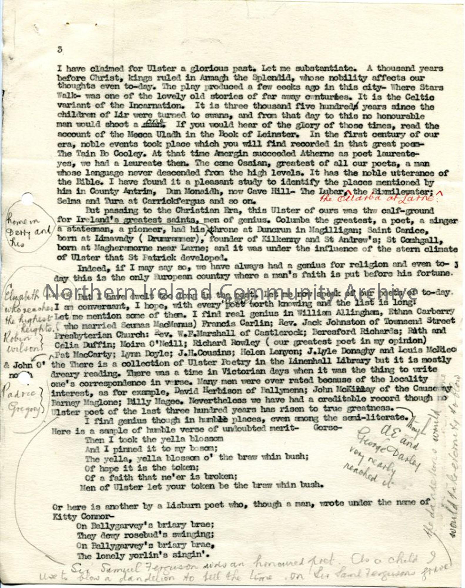 3 of 6 typed pages of script, with added handwritten notes, under heading 'The Divine Spark - A Study of Ulster Genius' - for talk given to 2 Rotary Clubs. Deals with kings of ancient past, saints of Golden Era, politicians, officers, actors, artists, poets, music - occasional poem included. Dated 17.6.1940.
