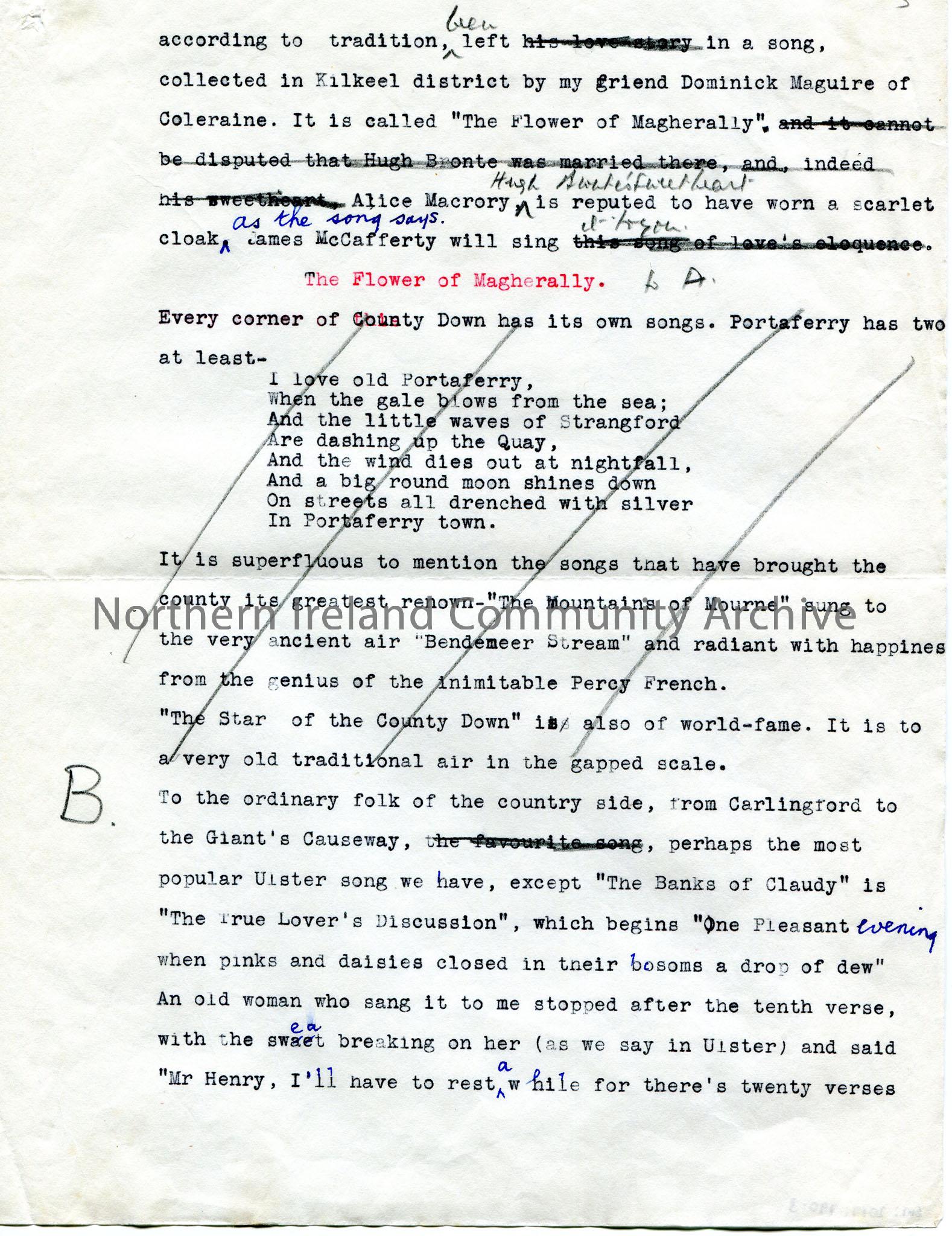Page 3 of 6. Typed script, rough annotated copy, for broadcast, titled, ‘Songs of Down and Armagh.’ Same script as CM:2017:789.1-4. ‘All songs in red’…