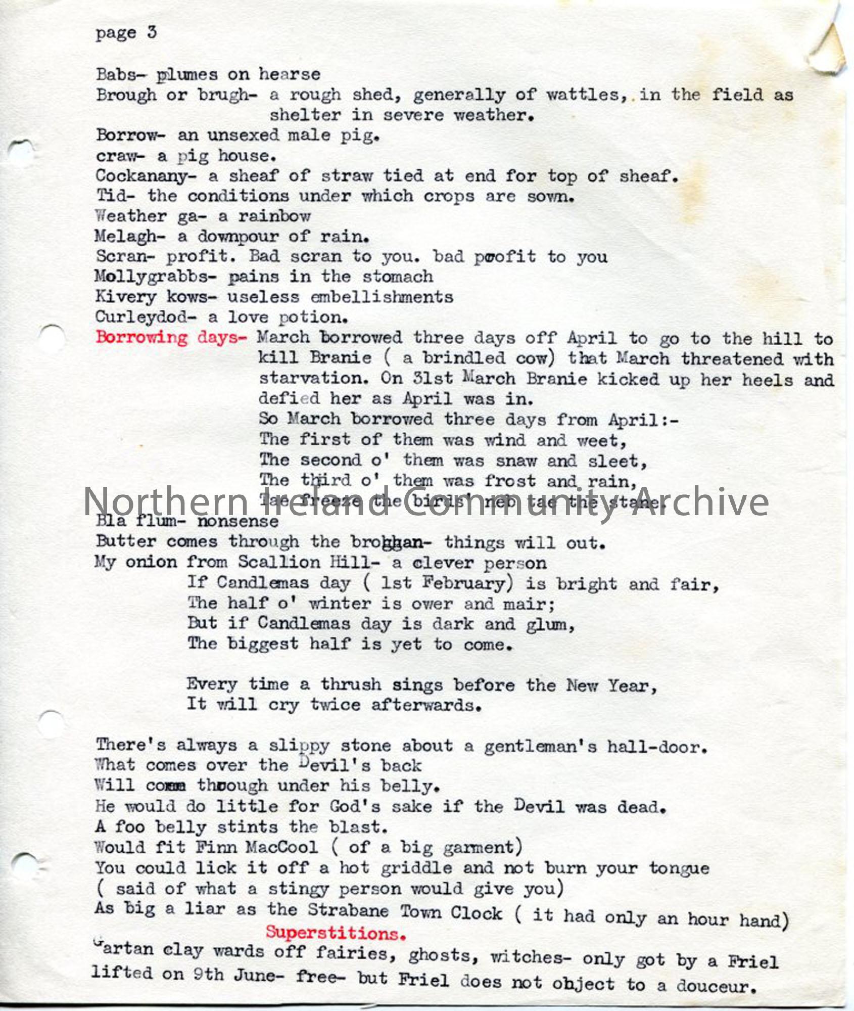 Page 3 of 7 typed pages under heading of 'Commonplace Book of J W Foster'. Contains sections on: Ulster Dialect, with definitions of words ; traditional practices/ cures for ills, with their attributed origins; folklore and ghost stories. Dated 17th April 1943.
