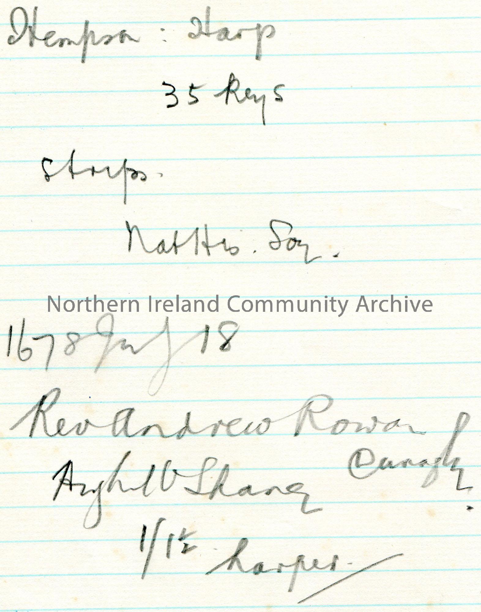 Page 3 of 7. Handwritten notes in pencil on lined paper. Not in context. Re surnames O’Neill, McDonald, O’Kane; harp.