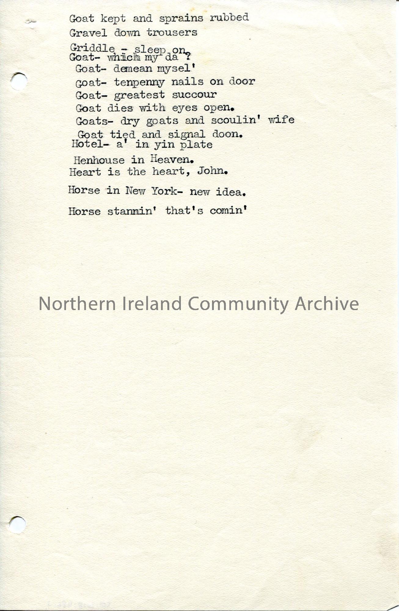 Page 3 of 7. Typed list in alphabetical order of notes. This page has G-H notes. A lot of the words refer to animals.