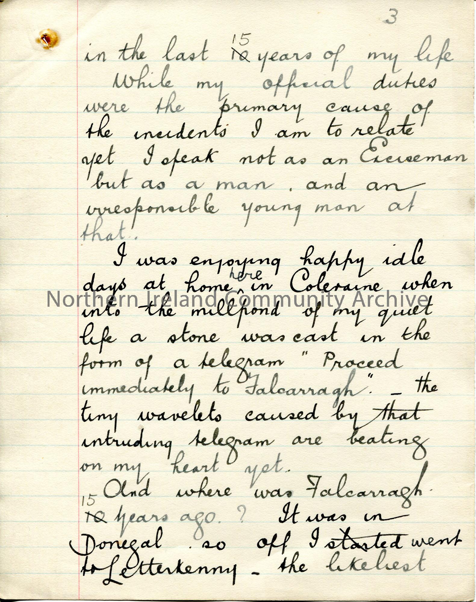 Page 3 of 71. Handwritten, rough essay [ for a talk? ] by Sam Henry titled 'Here and There in the King's Service'. Dated 1909 by JM. Sam Henry talks through his first 15 years of service as an Exciseman. He was based at Falcarragh, Ballymote in Co. Sligo, Lancashire, Uffculme and Omagh in Co. Tyrone.
