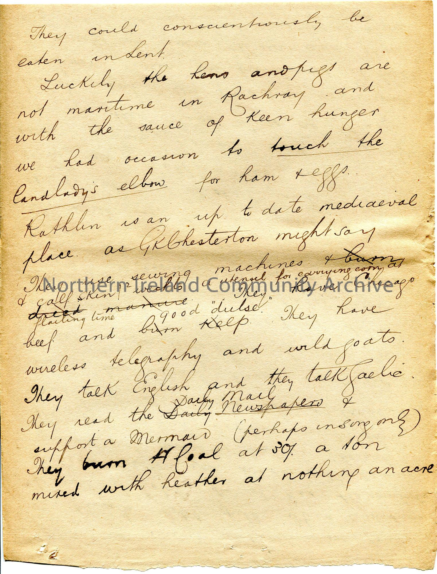 Page 3 of 8. Handwritten lecture (double sided) re a trip by Sam Henry to Rathlin Island on 25th June. Describes the crossing on the Rathlin Mailboat,… – scan005f