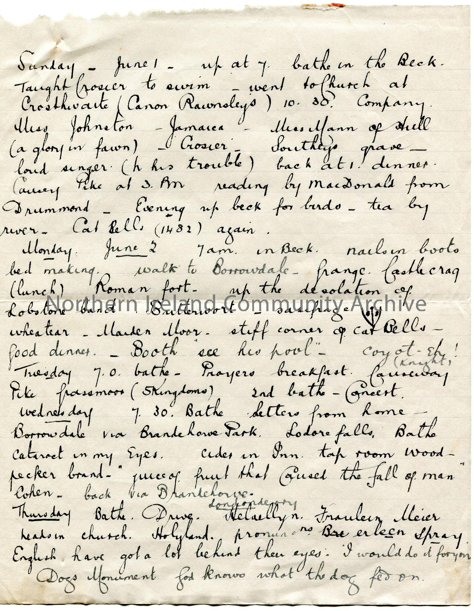 Page 3 of 8 of handwritten notes titled, ‘Holiday 31 May-19 June 1913’. Details of daily activities of travels around England.