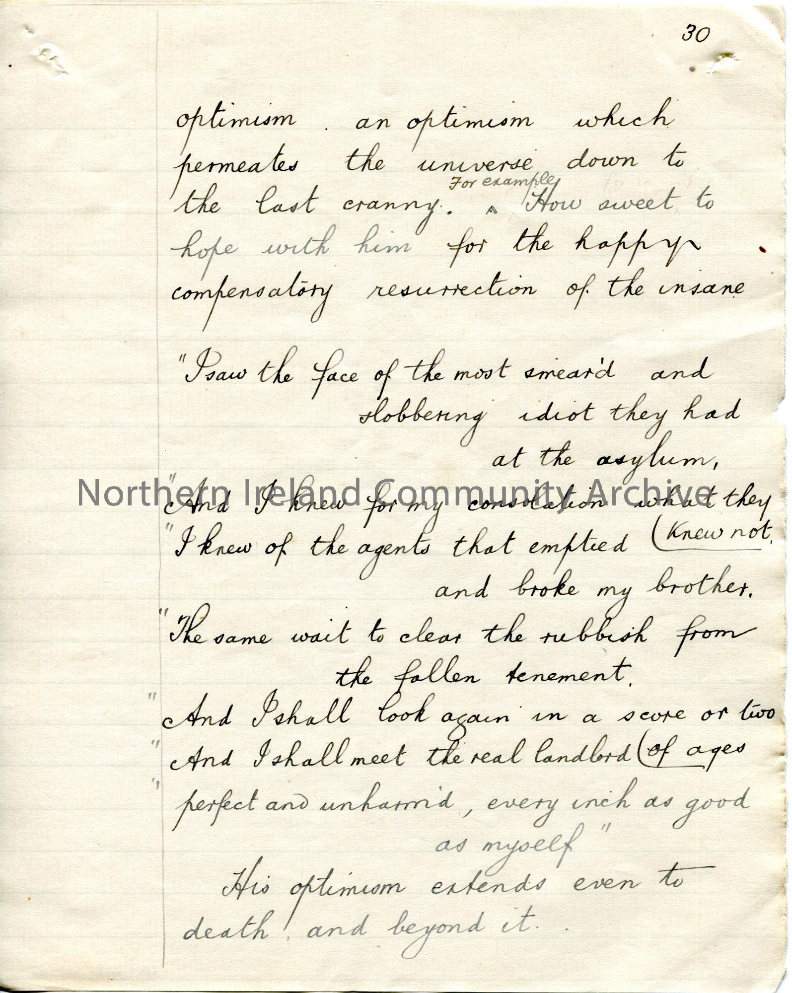 Page 30 of 43. Handwritten essay by Sam Henry titled, ‘Walt Whitman. The Bard of Personality’. Short biography of Whitman and discussion of his poetry…