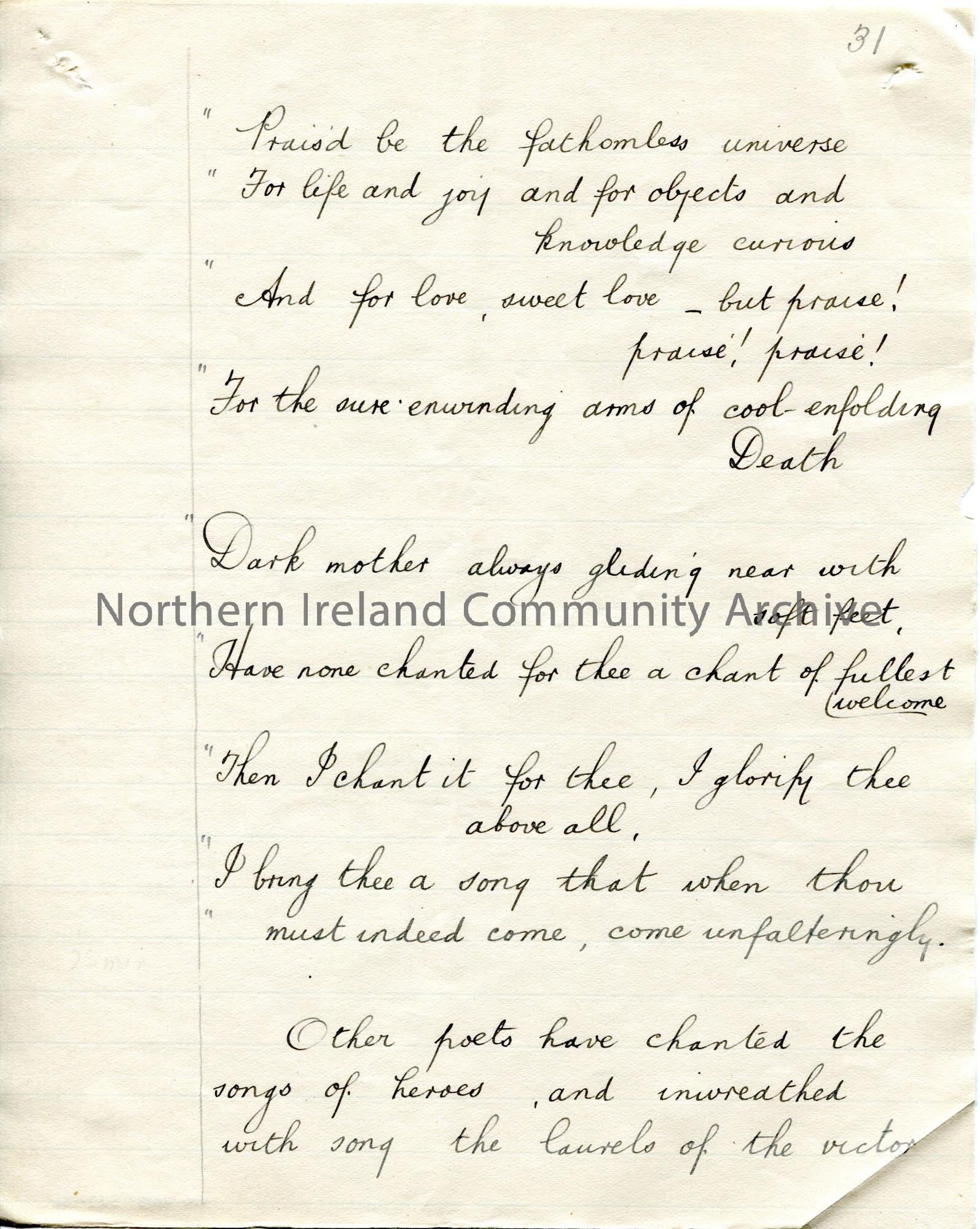 Page 31 of 43. Handwritten essay by Sam Henry titled, ‘Walt Whitman. The Bard of Personality’. Short biography of Whitman and discussion of his poetry…
