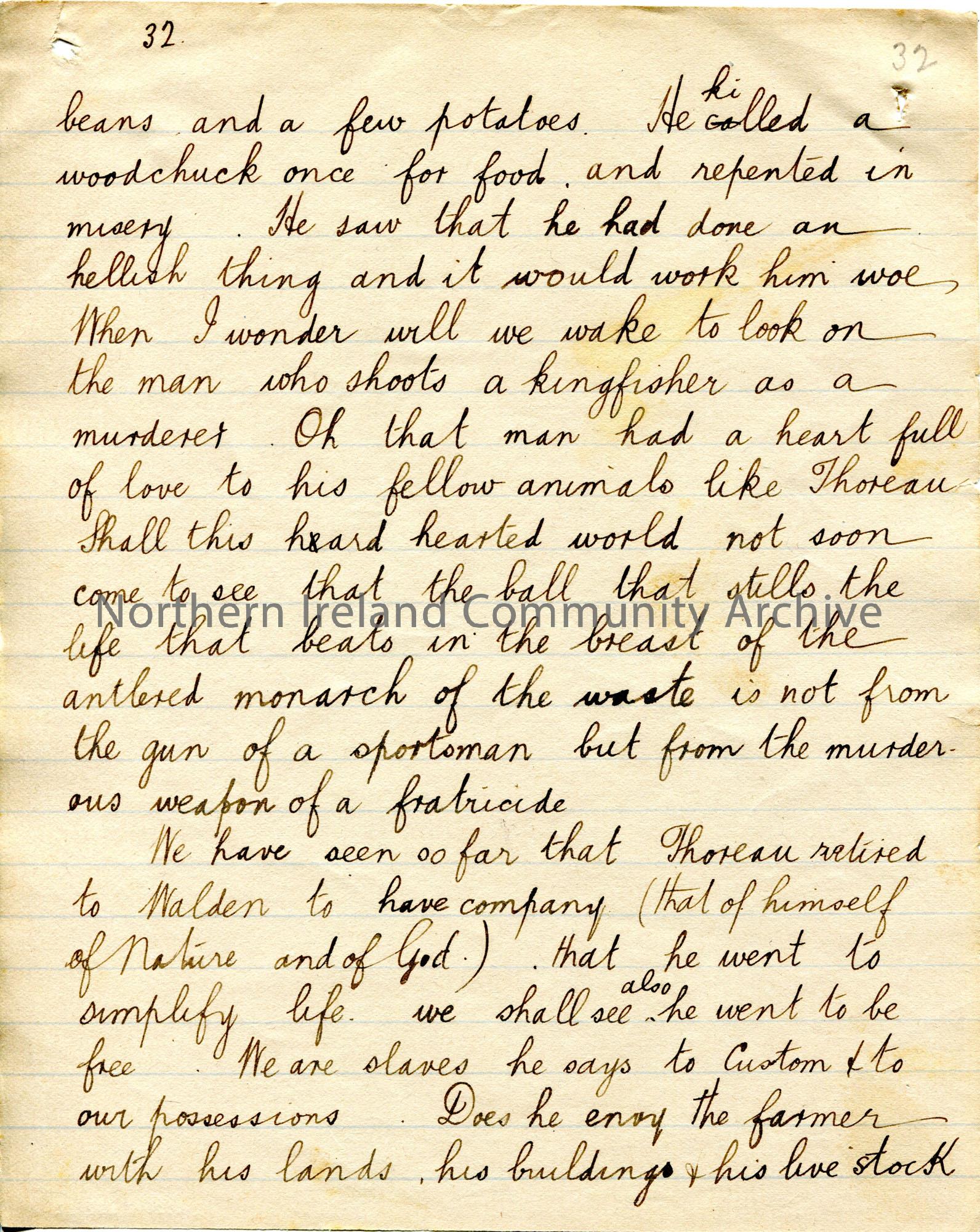 Page 32 of 38. Handwritten essay by Sam Henry titled, 'The Hermit of Walden'. Philosophical essay re Henry David Thoreau. Sam presents this essay to the 'Association'.