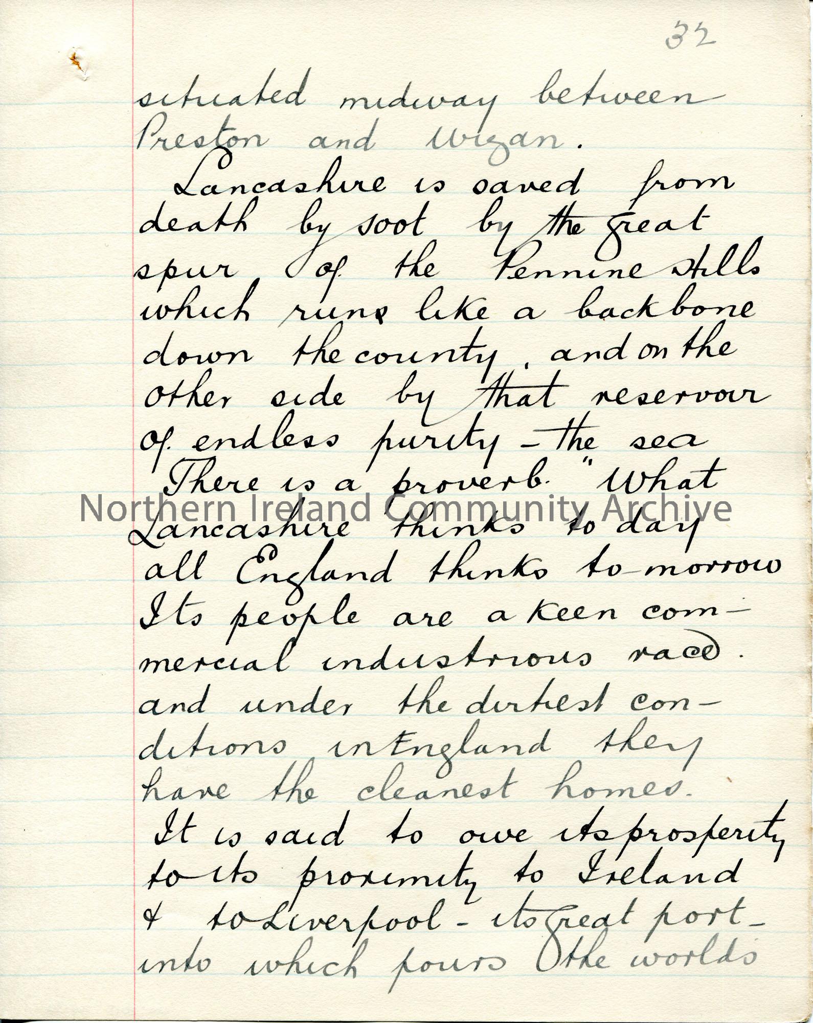 Page 32 of 71. Handwritten, rough essay [ for a talk? ] by Sam Henry titled 'Here and There in the King's Service'. Dated 1909 by JM. Sam Henry talks through his first 15 years of service as an Exciseman. He was based at Falcarragh, Ballymote in Co. Sligo, Lancashire, Uffculme and Omagh in Co. Tyrone.
