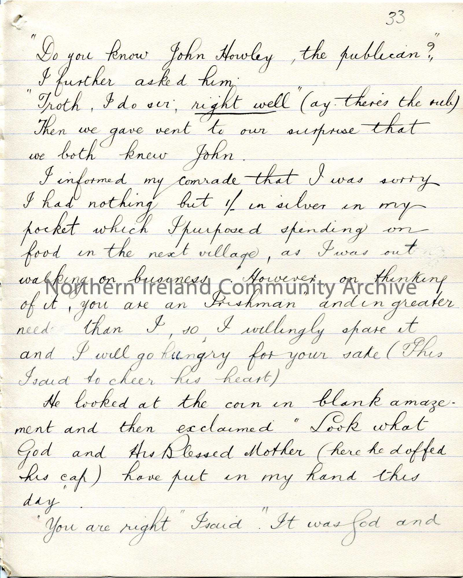 Page 33 of 38. Handwritten essay by Sam Henry titled, 'The Voice from the Ground'. 'Essay - Handshake' written in pencil above title. Re comradeship and Sam's encounters with various people. Contains rough notes on back of some pages of responses to the essay.