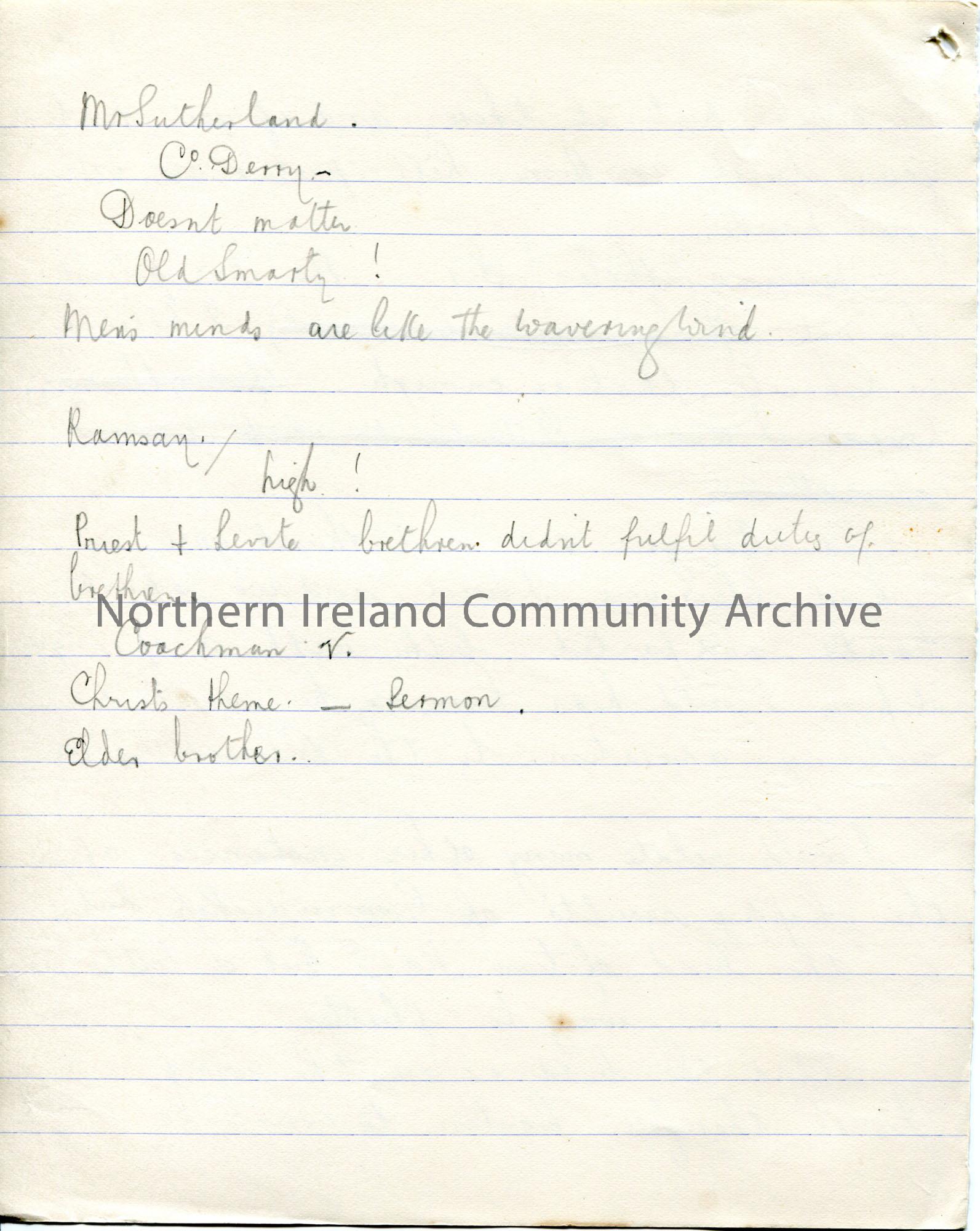 Page 34 of 38. Handwritten essay by Sam Henry titled, 'The Voice from the Ground'. 'Essay - Handshake' written in pencil above title. Re comradeship and Sam's encounters with various people. Contains rough notes on back of some pages of responses to the essay.