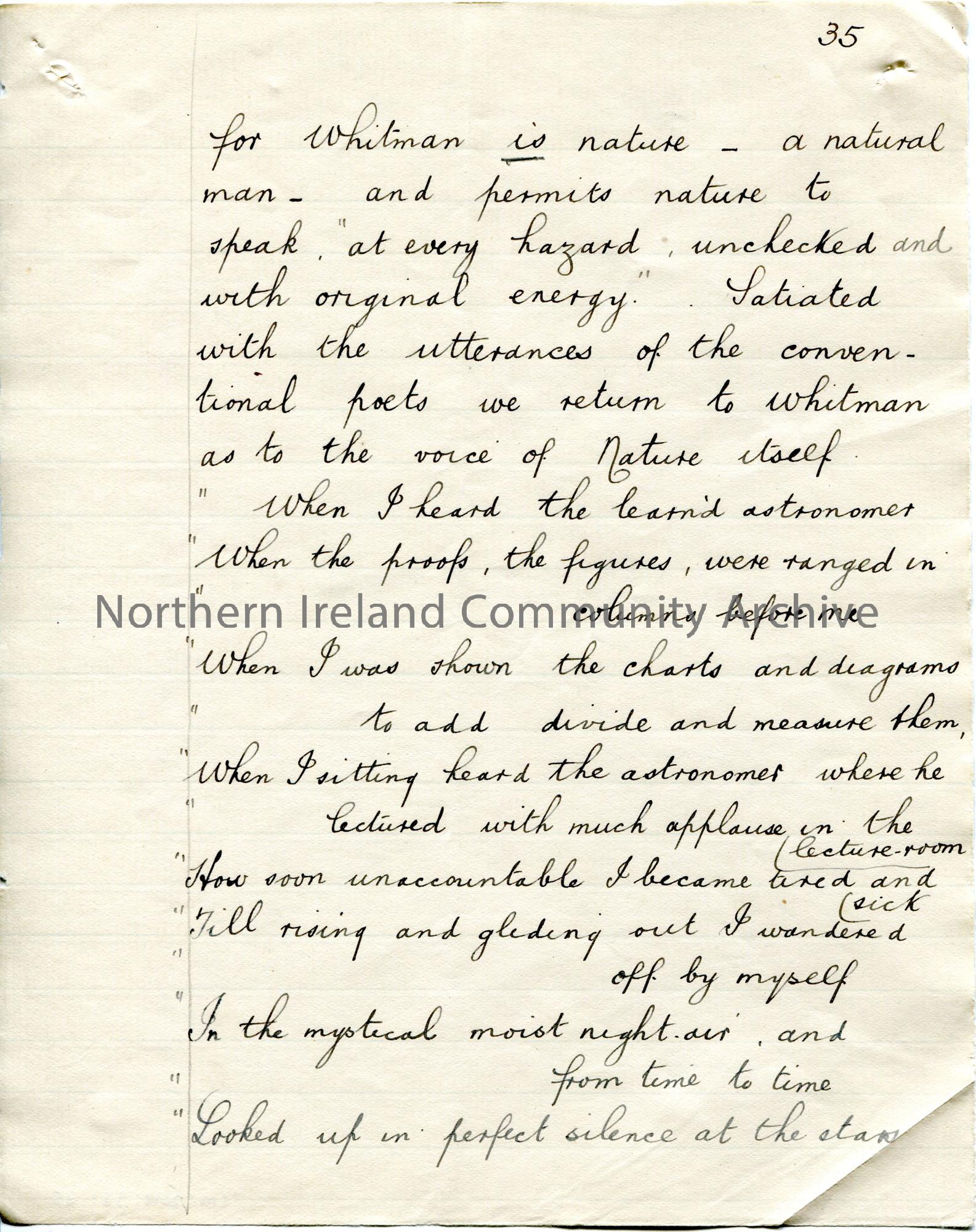 Page 35 of 43. Handwritten essay by Sam Henry titled, ‘Walt Whitman. The Bard of Personality’. Short biography of Whitman and discussion of his poetry…