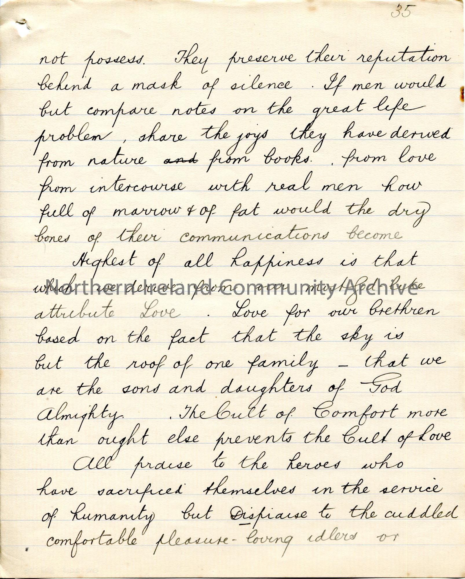 Page 36 of 39. Handwritten essay by Sam Henry titled, 'The Cult of Comfort'. Title is scored out. Dated Omagh, December 1905. Religious, philosophical essay discussing happiness, comfort, charity, love. Includes various songs and poems. Discusses classes, rich and poor.