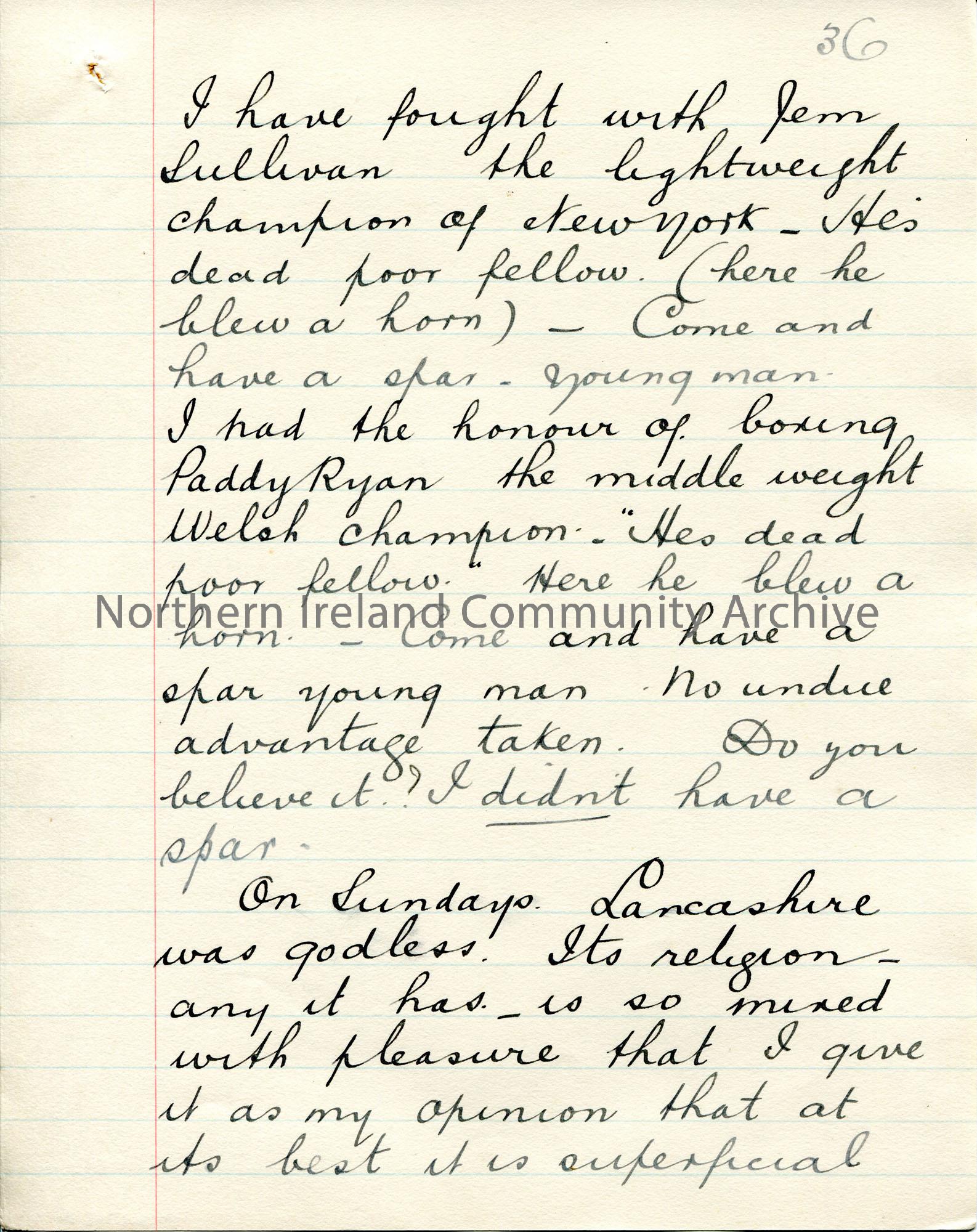Page 36 of 71. Handwritten, rough essay [ for a talk? ] by Sam Henry titled 'Here and There in the King's Service'. Dated 1909 by JM. Sam Henry talks through his first 15 years of service as an Exciseman. He was based at Falcarragh, Ballymote in Co. Sligo, Lancashire, Uffculme and Omagh in Co. Tyrone.