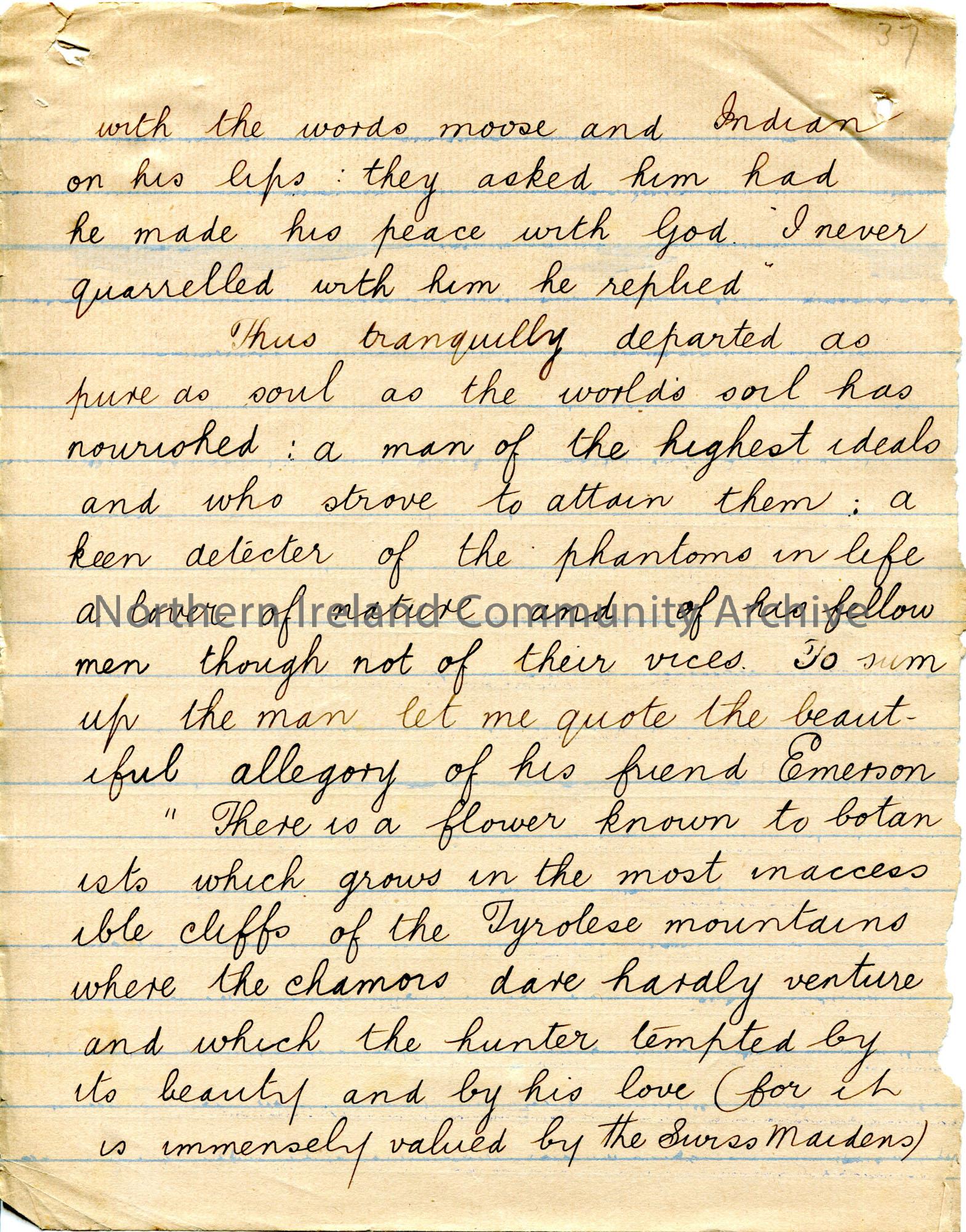 Page 37 of 38. Handwritten essay by Sam Henry titled, 'The Hermit of Walden'. Philosophical essay re Henry David Thoreau. Sam presents this essay to the 'Association'.