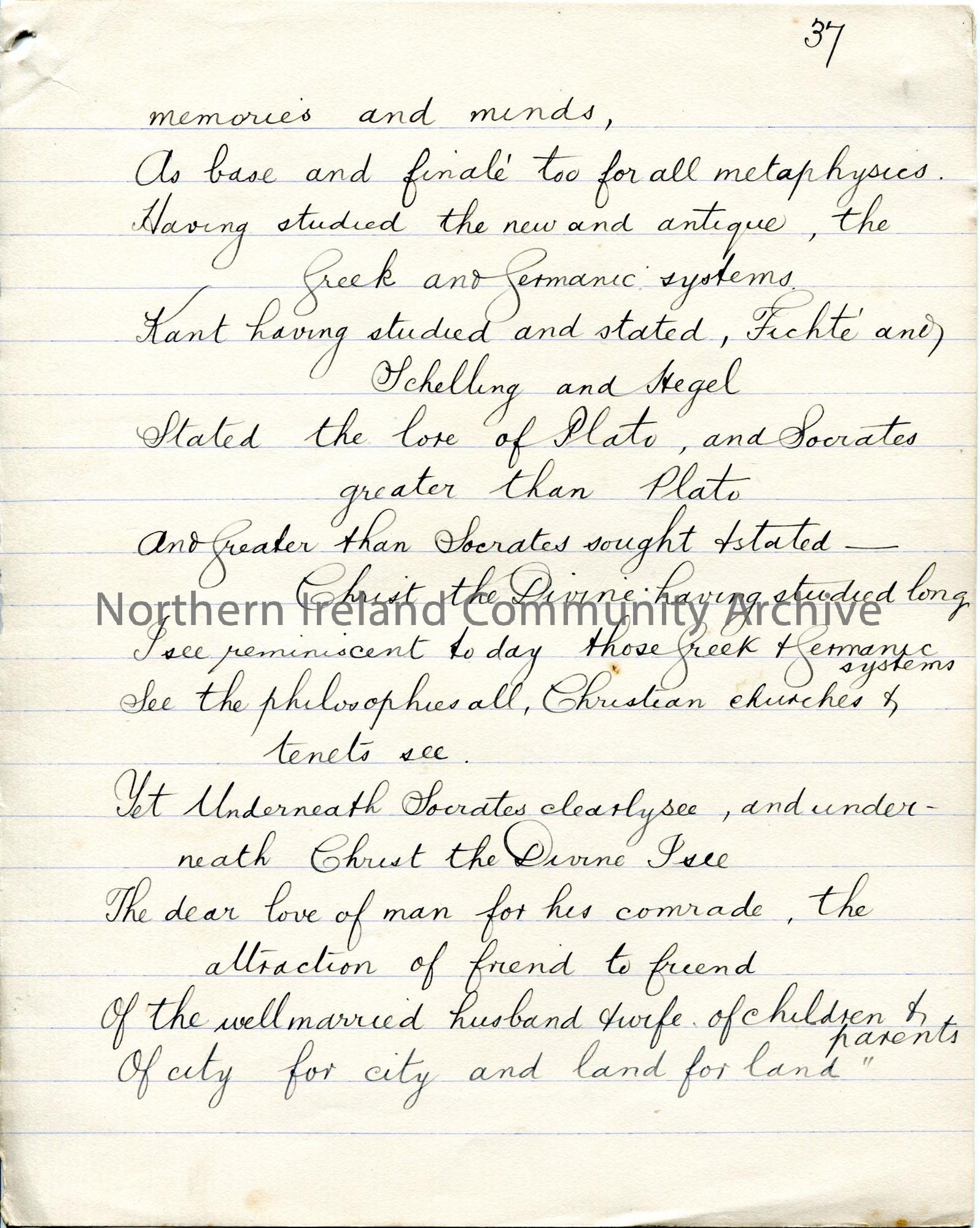 Page 37 of 38. Handwritten essay by Sam Henry titled, ‘The Voice from the Ground’. ‘Essay – Handshake’ written in pencil above title. Re comradeship a…