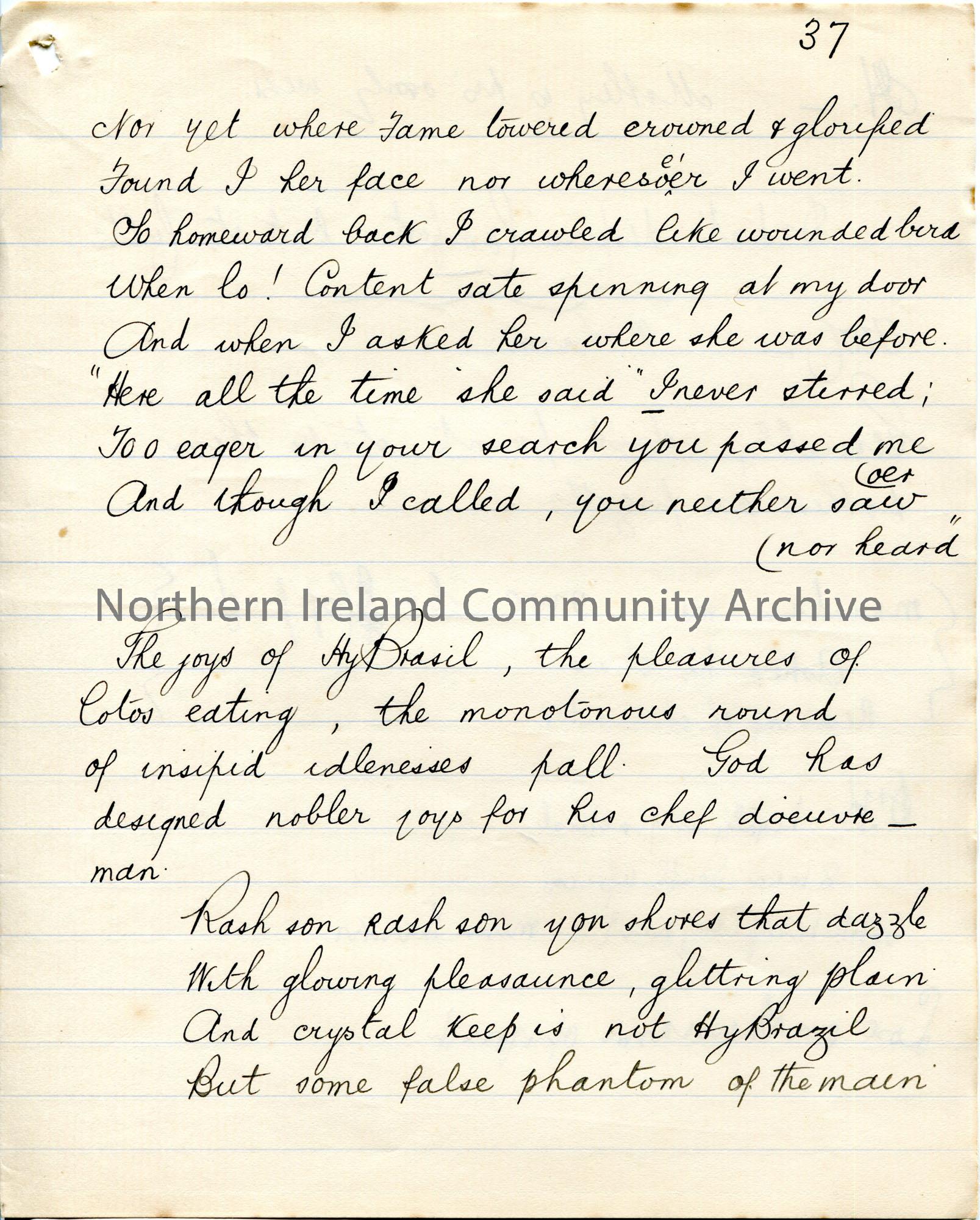 Page 38 of 39. Handwritten essay by Sam Henry titled, 'The Cult of Comfort'. Title is scored out. Dated Omagh, December 1905. Religious, philosophical essay discussing happiness, comfort, charity, love. Includes various songs and poems. Discusses classes, rich and poor. Handwritten rough notes in pencil on reverse.