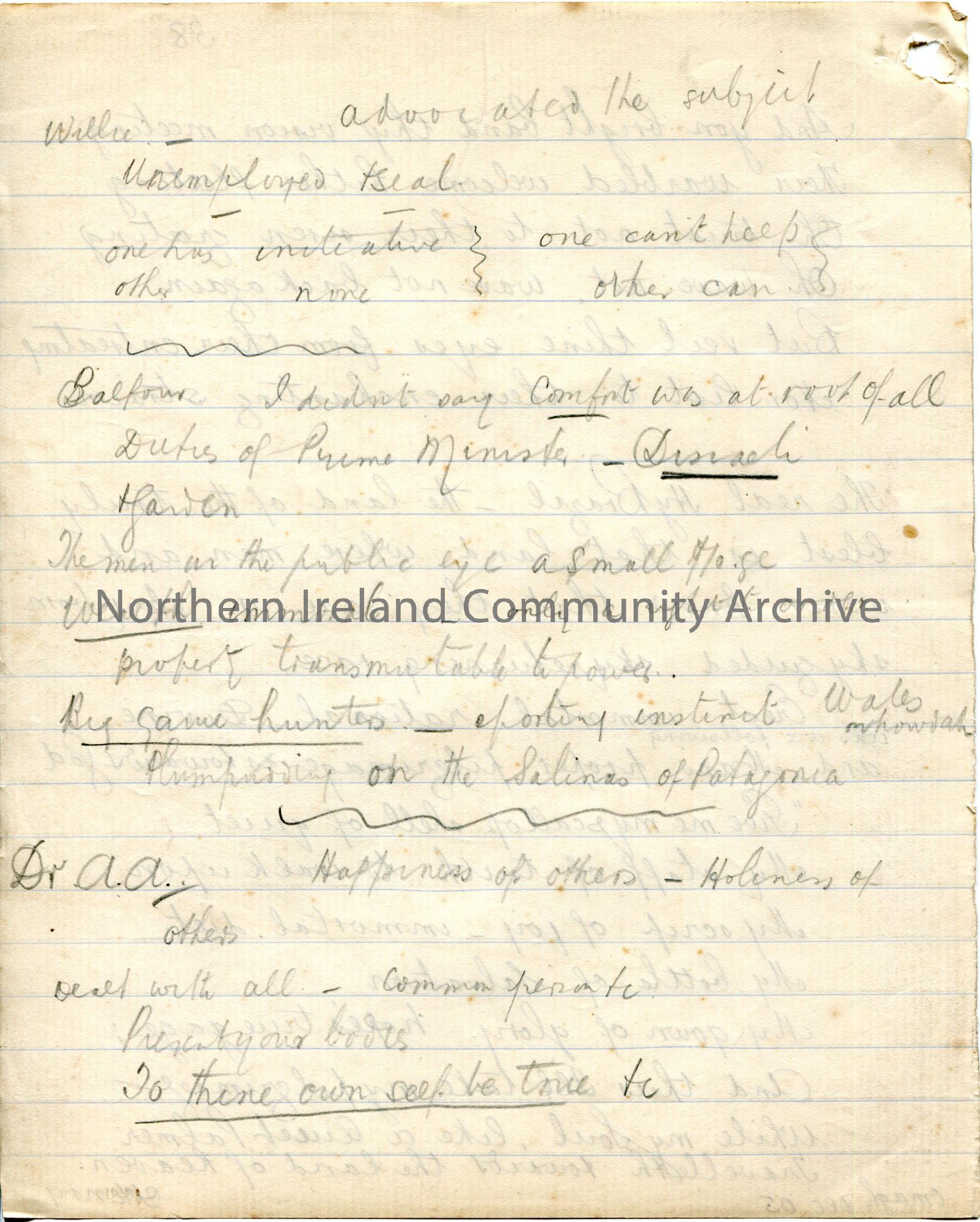 Page 39 of 39. Handwritten essay by Sam Henry titled, 'The Cult of Comfort'. Title is scored out. Dated Omagh, December 1905. Religious, philosophical essay discussing happiness, comfort, charity, love. Includes various songs and poems. Discusses classes, rich and poor. Handwritten rough notes in pencil on reverse.