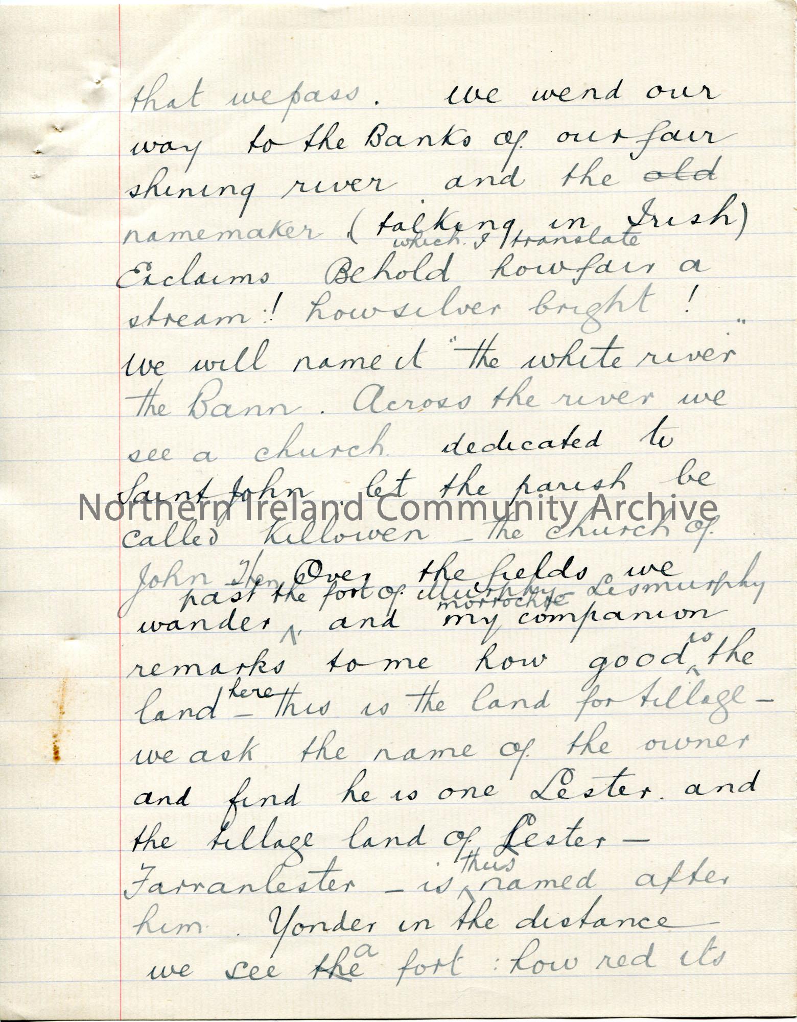 Page 4 of 10. Handwritten notes titled, 'A Walk with the Old Name Makers'. '7.38 10 minutes' handwritten and scored out on front page. Covers Irish placenames and their meaning/history. Mentions Killowen, Farranlester, Dundurg, Ballinteer, Farranseer, Masteragwee, Mullanhead, Ballycairn, Coleraine, Aghadowey, Agivey, Carrownamucla, Cullycapple, Droghead, Bovagh, Drumcroon, Knockertolan.