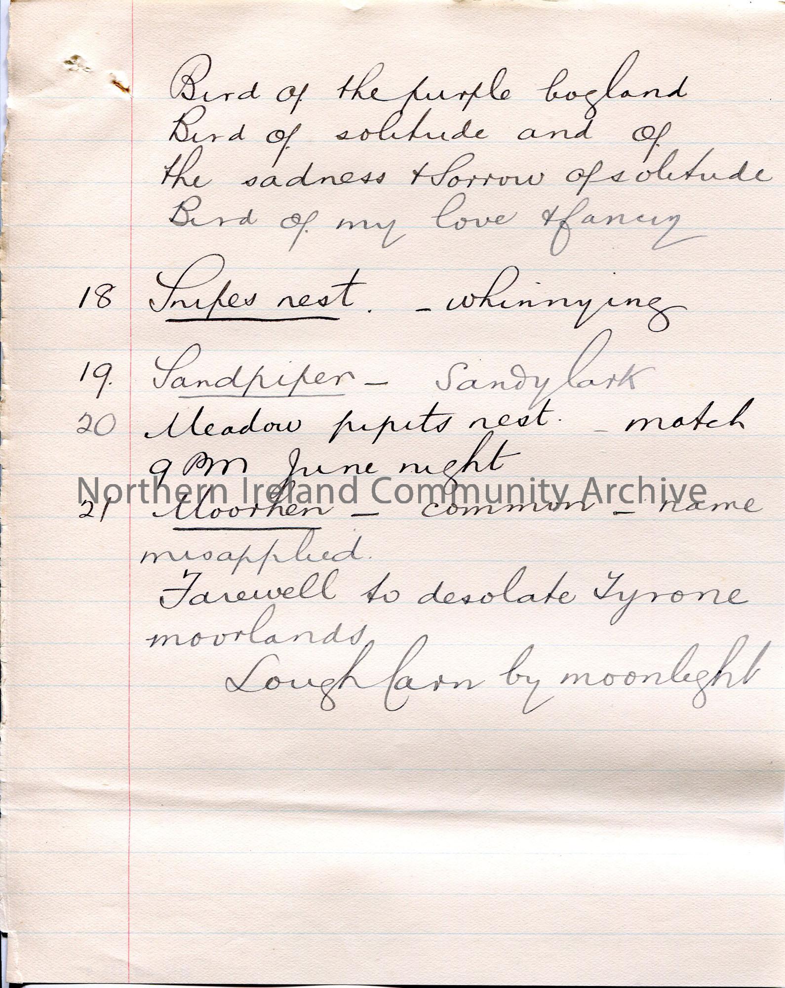 Page 4 of 10. Handwritten rough notes (lined paper) for lecture by Sam Henry titled, 'On way to Lough na Tarpoge'. Notes are numbered for slides 3-41. Re a nesting ramble in Tyrone.