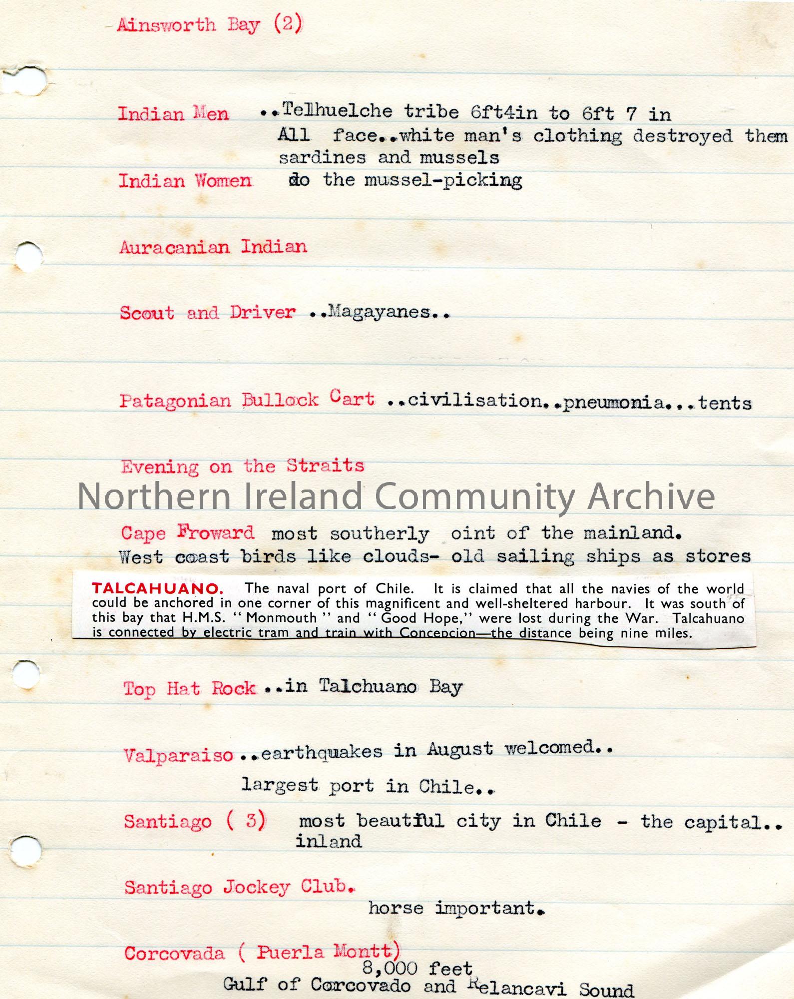 Page 4 of 12. Typed list on lined paper of placenames re South America. Cutting pasted to bottom half of page re Talcahuano, Chile.
