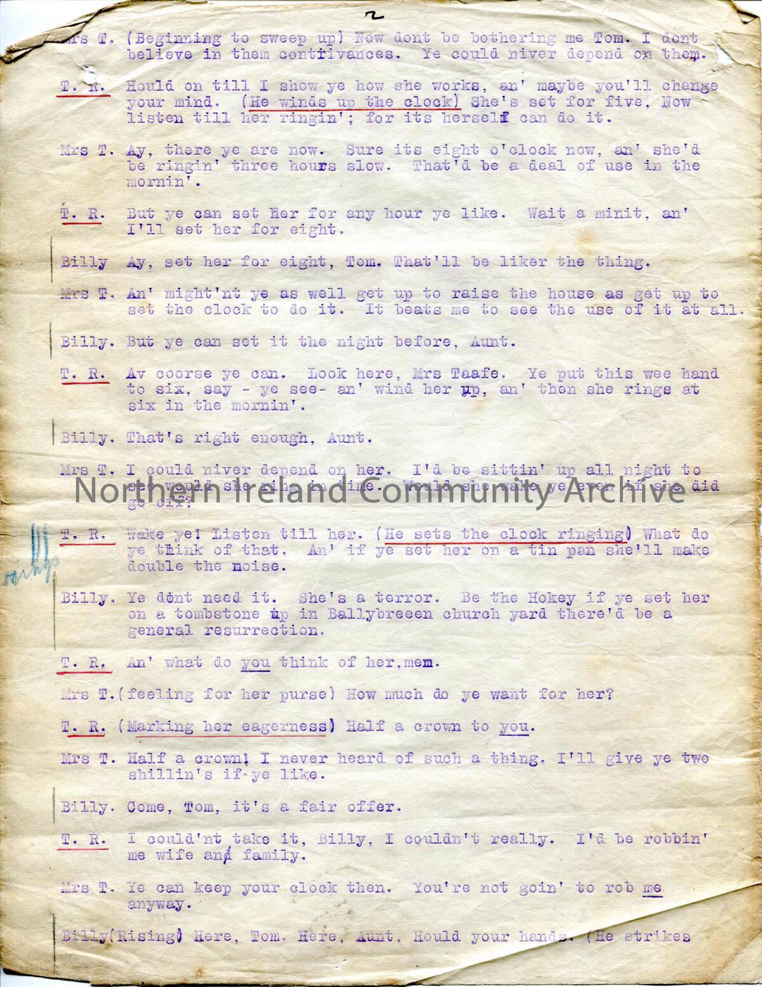 Page 4 of 16. Typed script for play ‘The Alarm Clock. A farce in one act by Lynn Doyle’. Re an alarm clock which is mistaken for an explosive device.