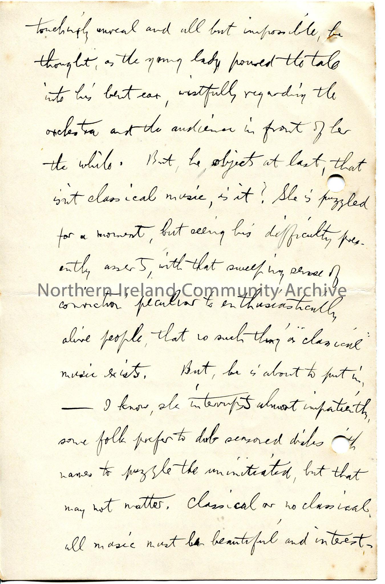 Page 4 of 24 page handwritten letter, on both sides of paper - author appears to have left Coleraine and now live in Glasgow. Mentions Irish Society School. Writes about classical music, Ibsen plays, a fanciful sketch his own, and Irish theatre, writers and myths and legends.