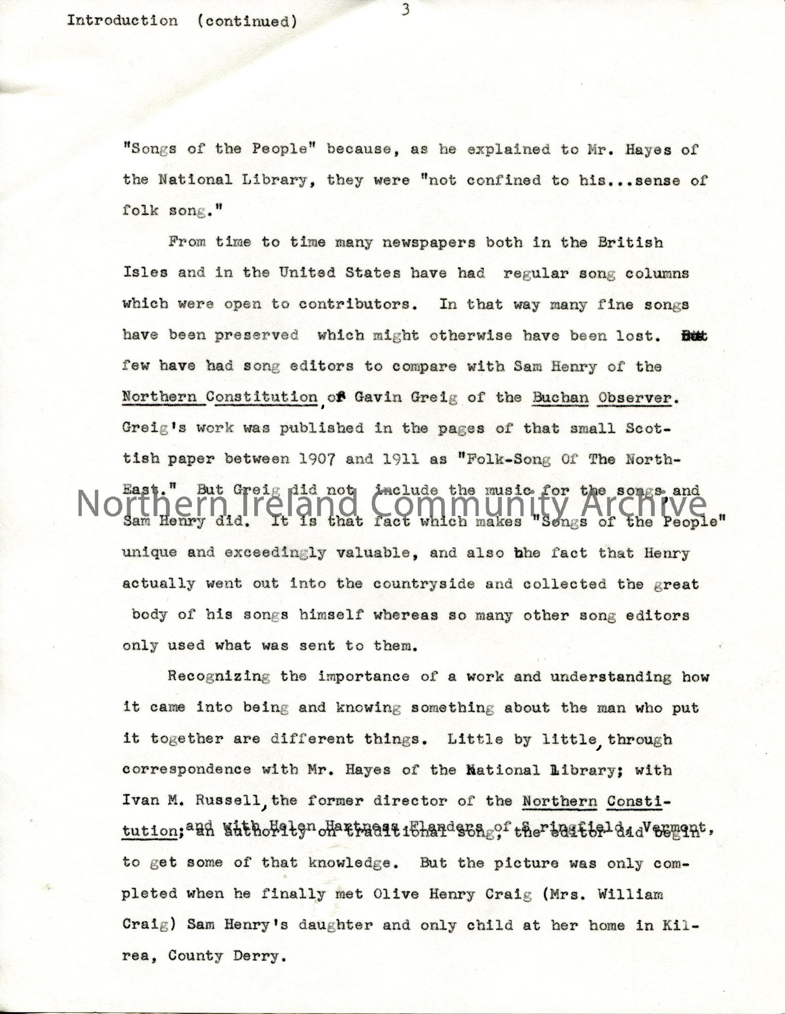Page 4 of 28. Typed manuscript for Sam Henry's Songs of the People edited by Gale Huntington. Annotated in black ink. Includes the introduction, text re Child Ballads, Laws Ballads, Other Ballads, Songs and Ballad-Like Songs, Chanteys, Lullabys and Signing Games, Bibliography and Index.