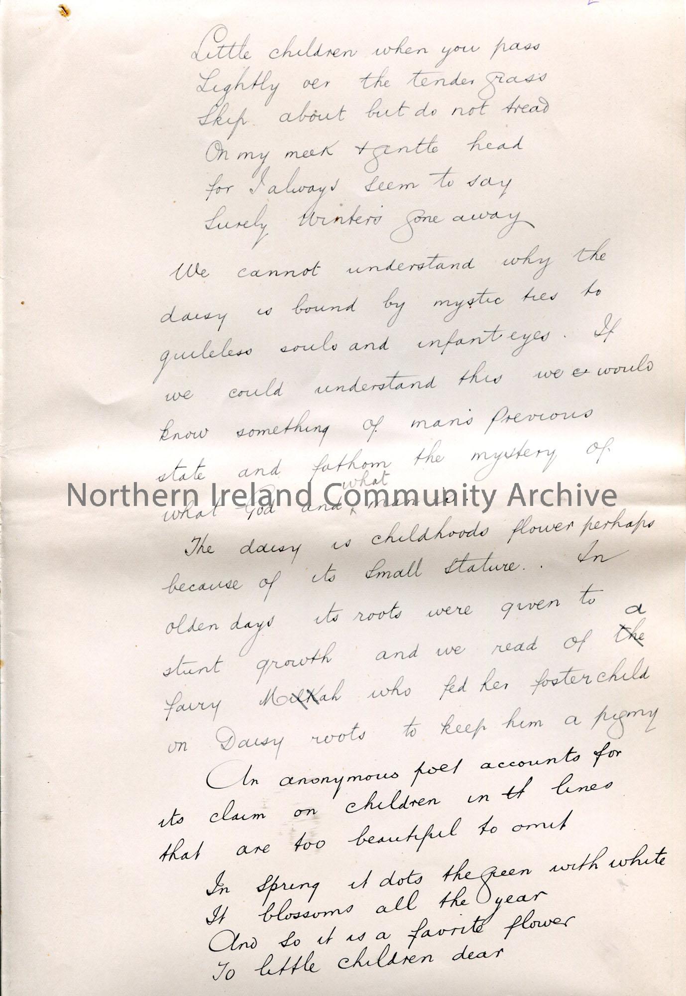 Page 4 of 33. Handwritten essay by Sam Henry titled, ‘The Daisy’. Re the flower. Pages not in order.