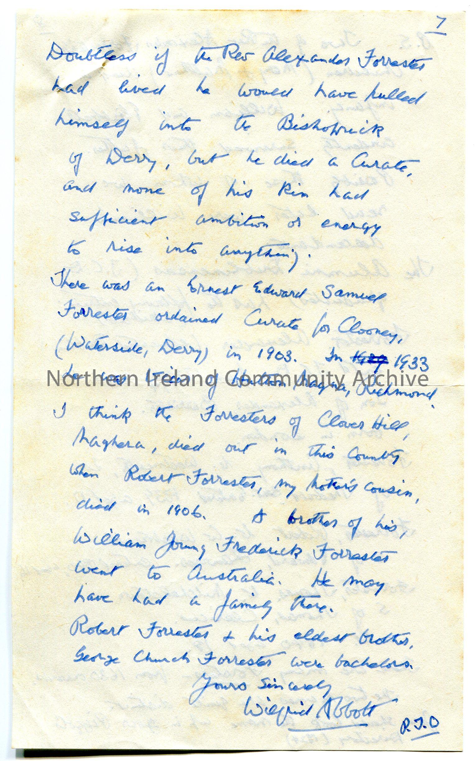 Page 4 of 4. Handwritten letter (double sided) to Mr Henry. Writes of Rev. Alexander Forrester and his time as Curate of Derry Cathedral 1679-1685. Writes of Alexander Forrester's connections with Coleraine. Mentions the surname Church and its connections with Forrester
