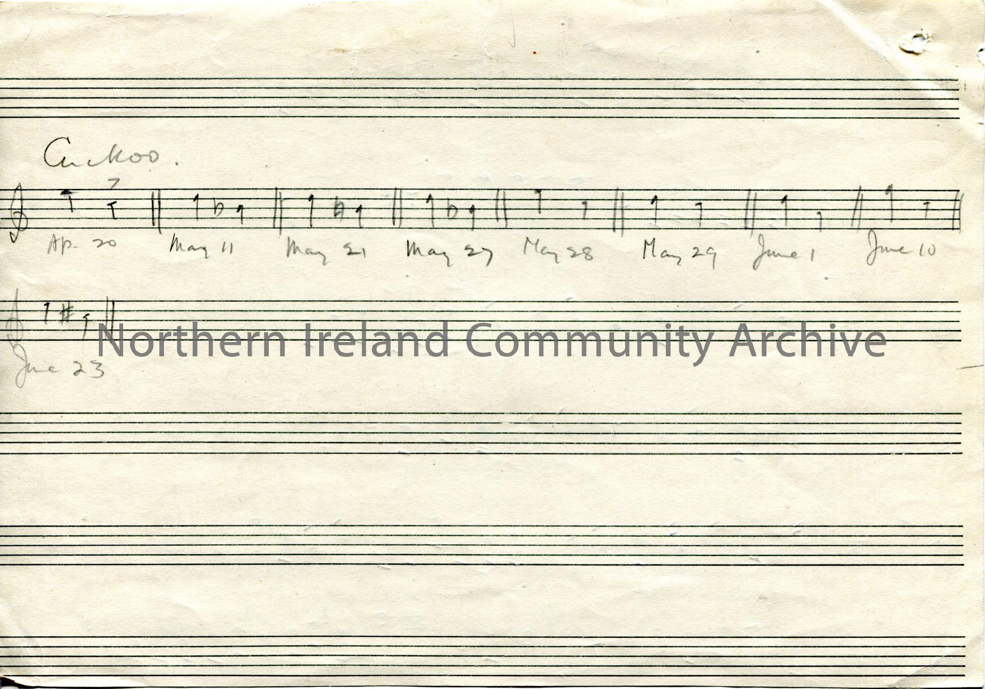 Page 4 of 4. Handwritten musical notes on strip of manuscript paper. Four songs titled, 'The Chaffinch', 'The Greenfinch Twitter Song,' and 'The Robin's Song'. Handwritten notes in pencil for 'Cuckoo' birdsong on reverse.