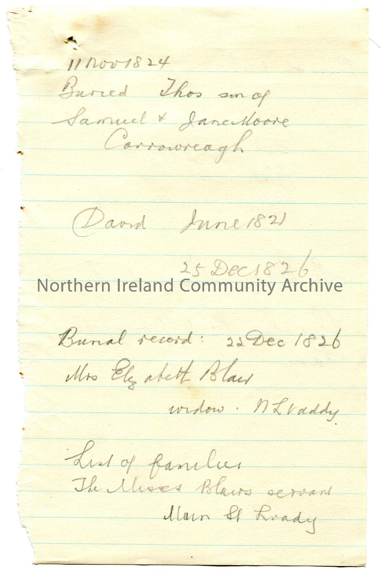 Page 4 of 4. Handwritten rough genealogical notes (double sided) on lined paper re Blair and Moore family names. [Part of Sam's research into the 'Blair Inquiry'].