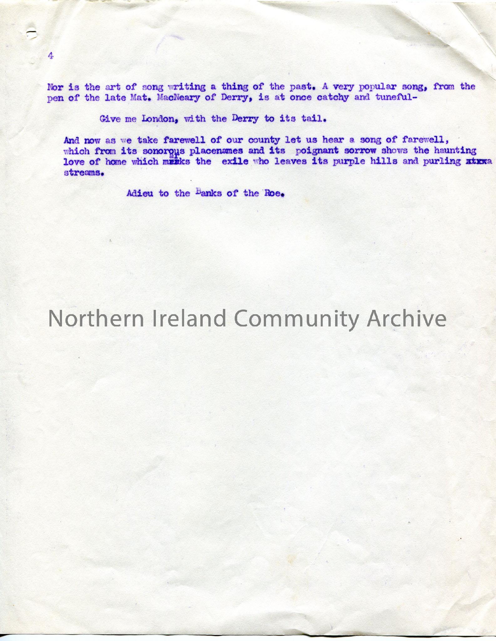 Page 4 of 4 of document titled, ‘The Music of County Londonderry’. Possible script for broadcast. Includes the history of the area, interspersed with …