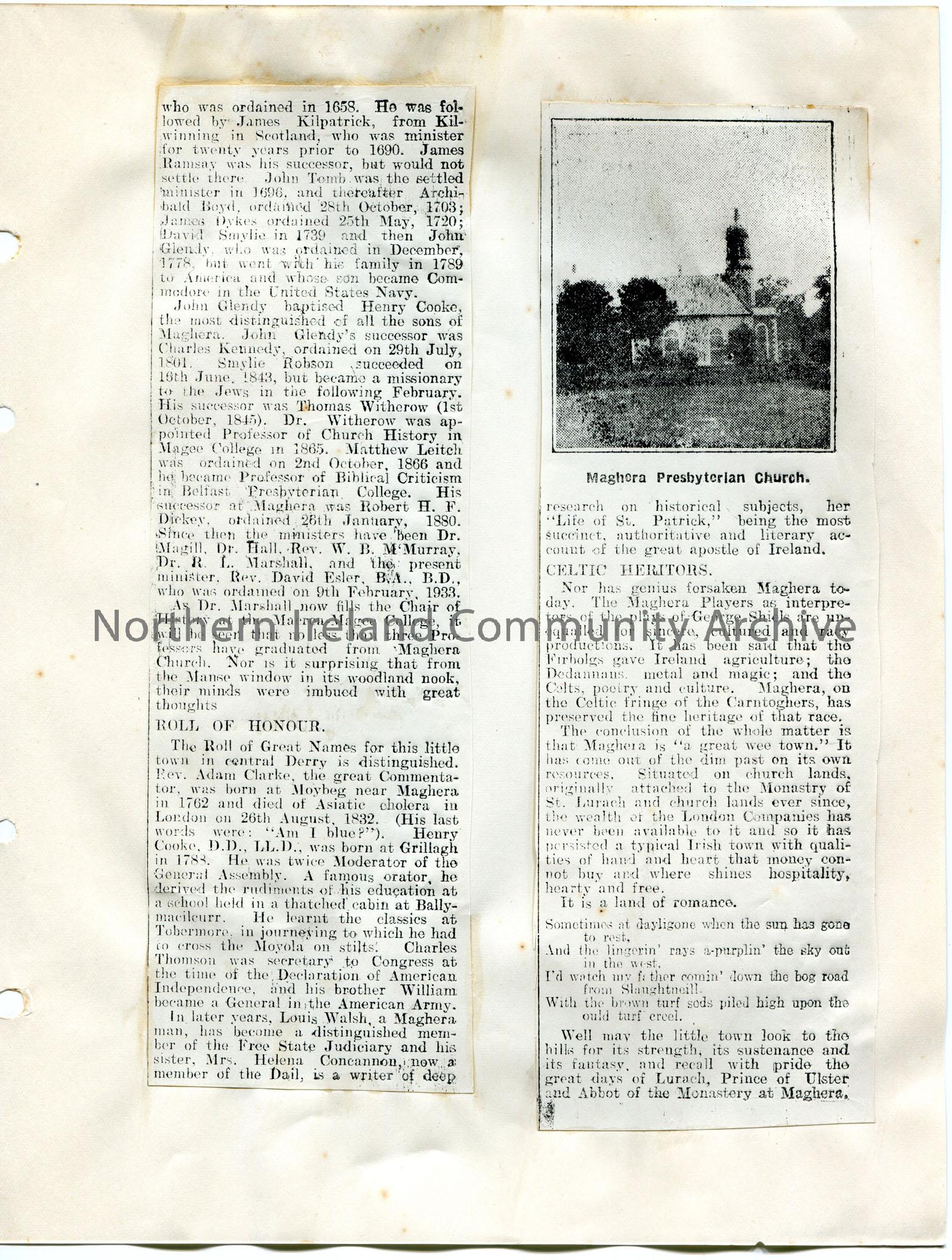 Page 4 of 4 of newspaper cuttings stuck to paper. Titled, 'In Search of Ulster. Maghera. In The Foothills of the Carntoghers.' Re history of the area. Mentions Largantogher, Grillagh bridge, Dunglady Fort, Maghera Presbyterian Church, Louis Walsh. Photographic image captioned 'Maghera Presbyterian Church'.
