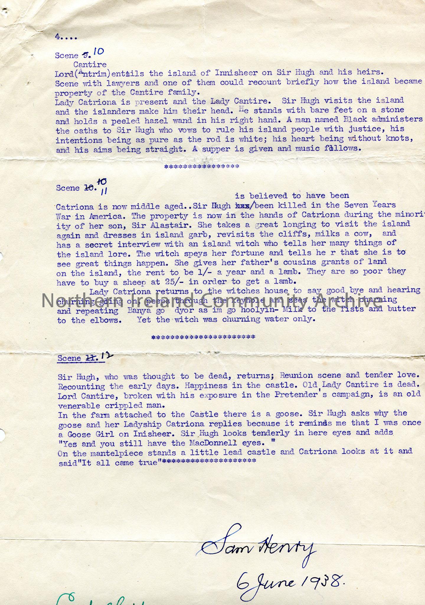 Page 4 of 4 of typed script titled, "Drowned Magpie: A Romance of Inisheer. Alternative title:- Lady Goose-Girl". Re Catriona, Lady Cantire, Sir Hugh. Script to include songs- "Ho Ro, My Nut-Brown Maiden", the Rathlin Island boat song; "The Enchanted Horse"; Luke Aylmer Connolly's song "To Rathlin Isle". 12 scenes. 'Sam Henry 6 June 1938' and 'Sandelford Coleraine 10?/1/42' written on last page.