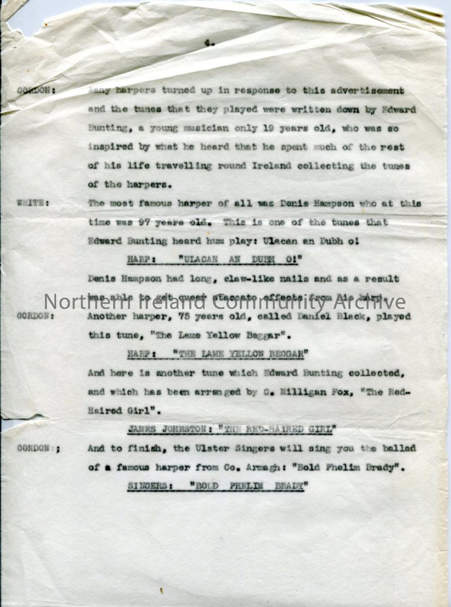 Page 4 of 4 typed pages of a script under heading 'Britain and its Music - The Harp That Once Was...'. Written for 2 speakers. About the harp - origins, Scottish link to airs played, festivals, famous harpers including Rory Dall O'Cahan and Denis Hempson. Interspersed with the titles of music to be played.