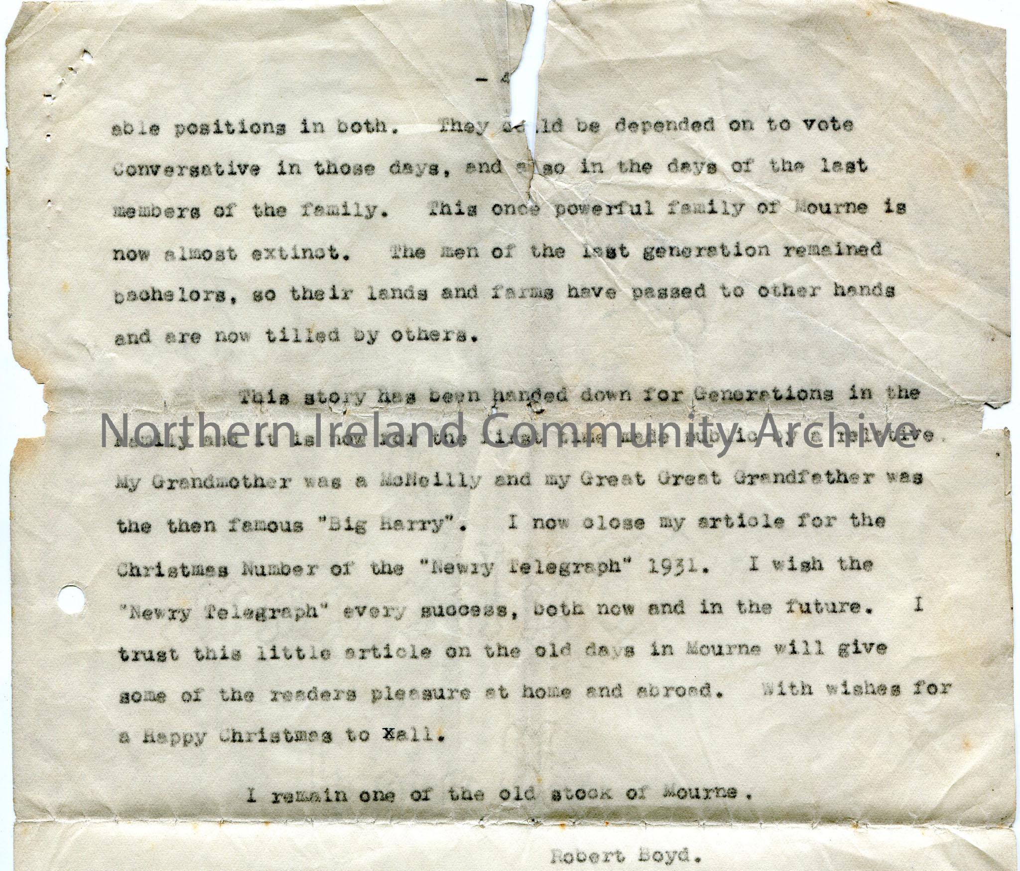 Page 4 of 4 typed document from the Newry Telegraph newspaper, dated 1931. Titled, 'The Last Voyage of the "Mary Stuart" to Mourne Waters'. By Robert Boyd, Kilkeel. Story re 'the old days in Mourne'.