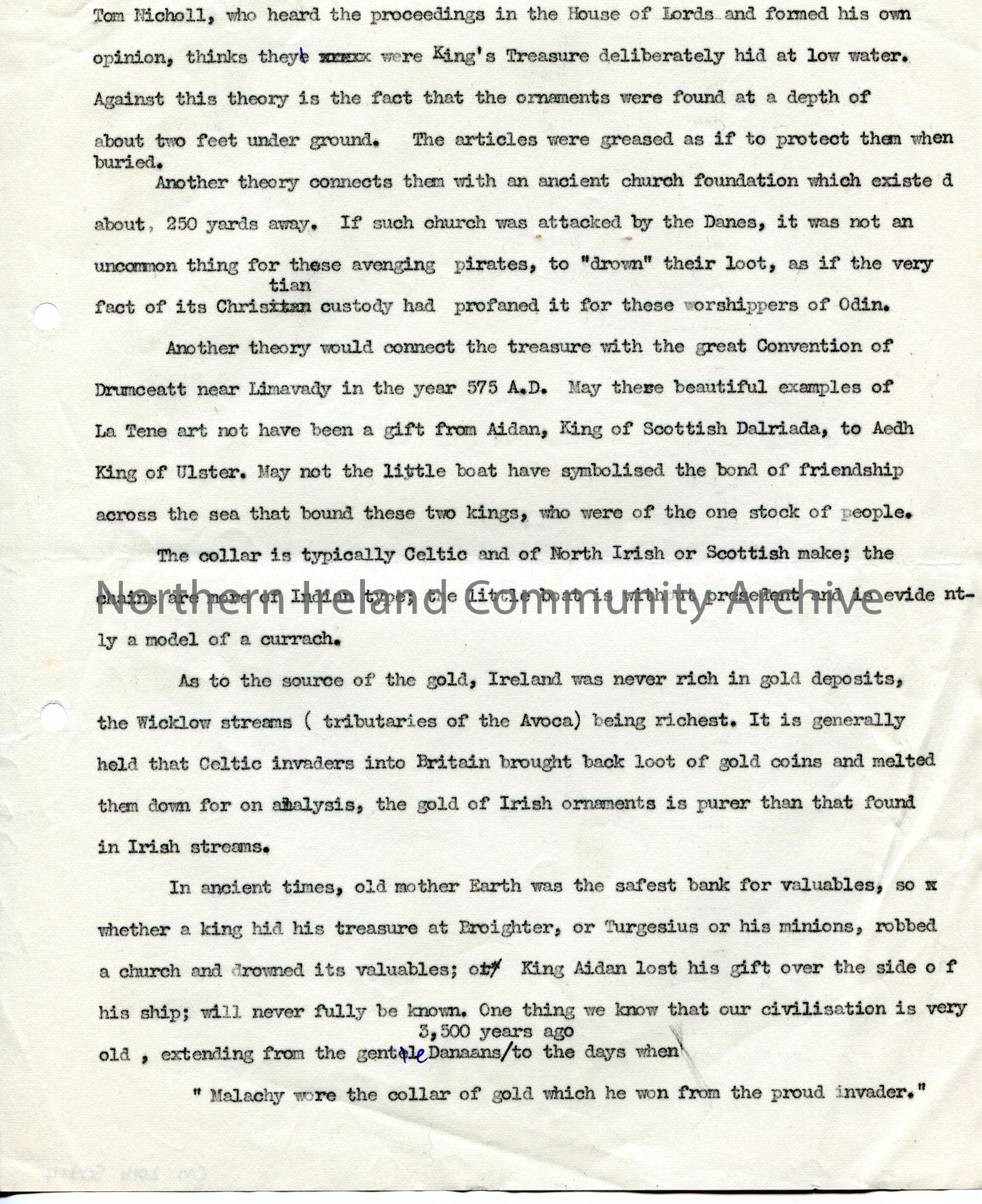 Page 4 of 4. Typed document titled, "Broighter Ornaments- Ulster's Rarest Treasure Trove. By Sam Henry, F.R.S.A.I". Annotated notes re the discovery of the Broighter gold hoard found in Limavady.