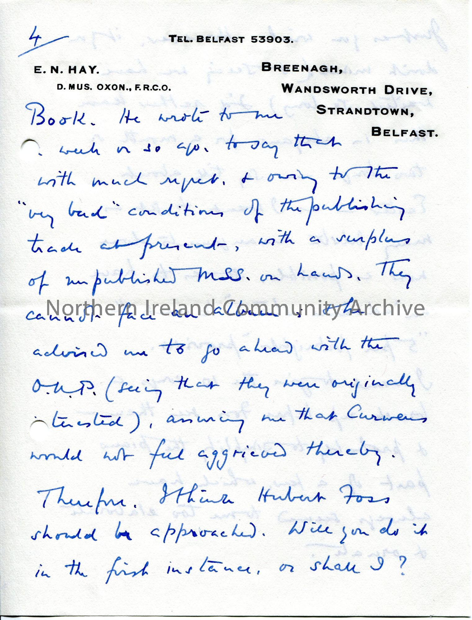 Page 4 of 5. Handwritten letter (first four pages double sided) to Sam Henry. Marked as private. Writing re the reconstitution of the Airs of Ulster scheme at the B.B.C. Mentions people - Sutthery, Brennan and Redmond Friel, Joan Trimble, Ogilvie, Jacobson. Also writes re the publishing of a book. Himself and Hessie attended the Ideal Home Exhibition and met Sam's uncle, Mr Davis.