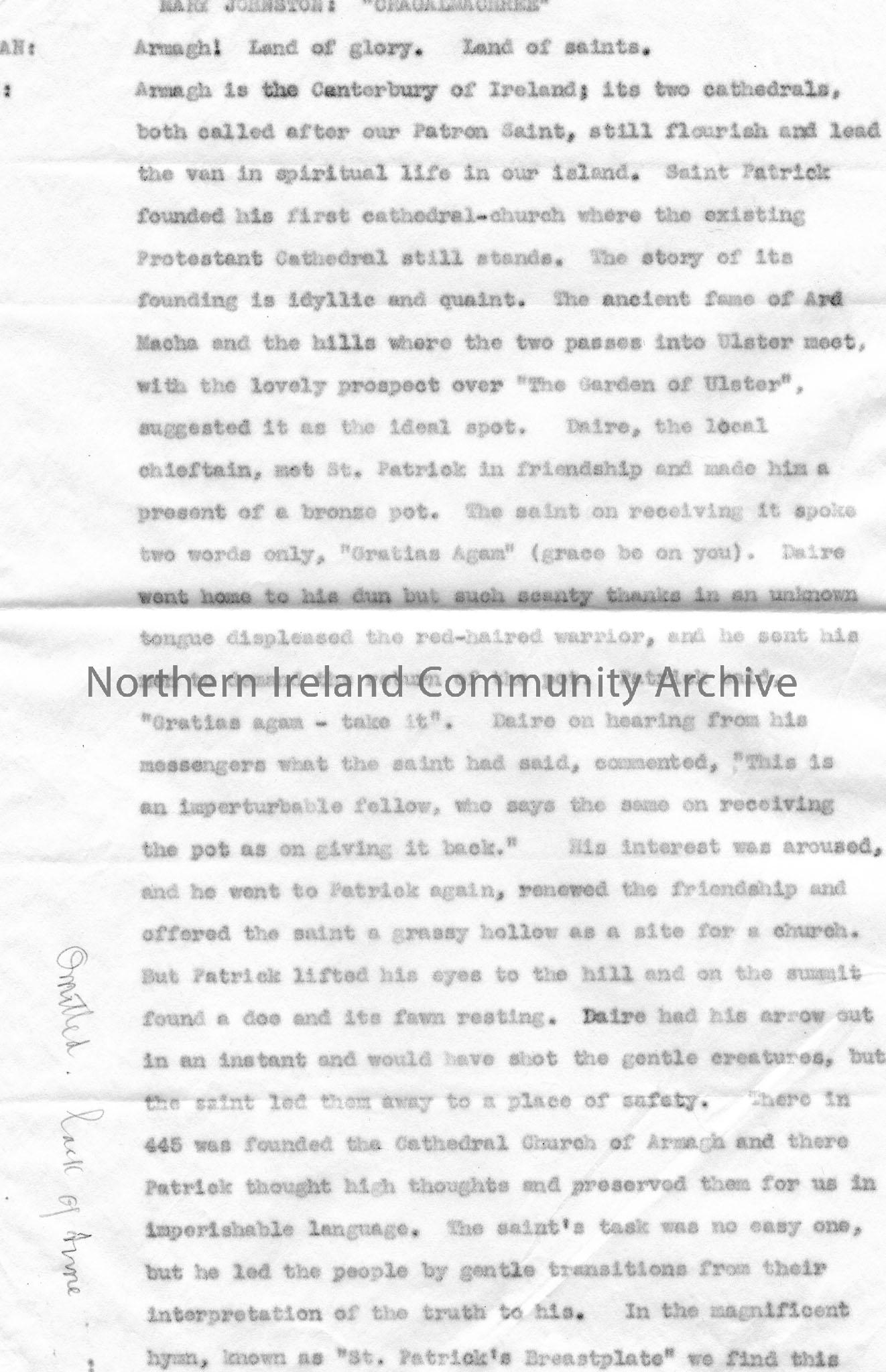 Page 4 of 5 of typed script titled, 'Britain and Its Music, The Music of Co.Armagh. From material supplied by Sam Henry'. Took place in Northern Ireland on Wednesday 18th June at 5.30-6.00pm as part of the Forces Programme. Script re the history of Armagh and the connections with the songs. Mary Johnston and George Beggs are singers and J. D. Orr is the flautist. Songs mentioned - 'Barossa', 'Lovely Sally', 'Drummond's Land', 'Master McGrath', 'Dobbin's Flowery Vale', 'Apples in Winter', 'In the County Armagh', 'Will the Weaver', 'Cragalmachree', and ends with the choir singing 'The Breastplate of St.Patrick'.