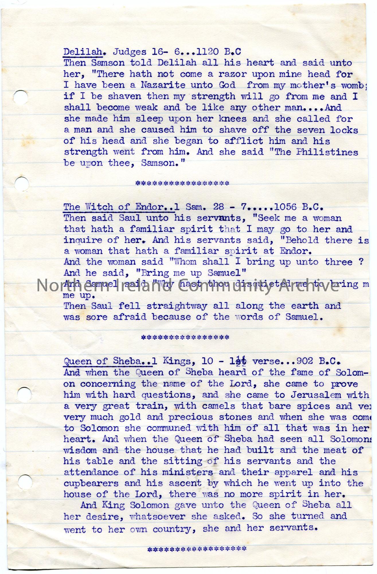 Page 4 of 5. Typed notes on lined paper for a Bible Class addressed to women. Talk is about women in Biblical times. Mentions Delilah, The Watch of Endor and Queen of Sheba.