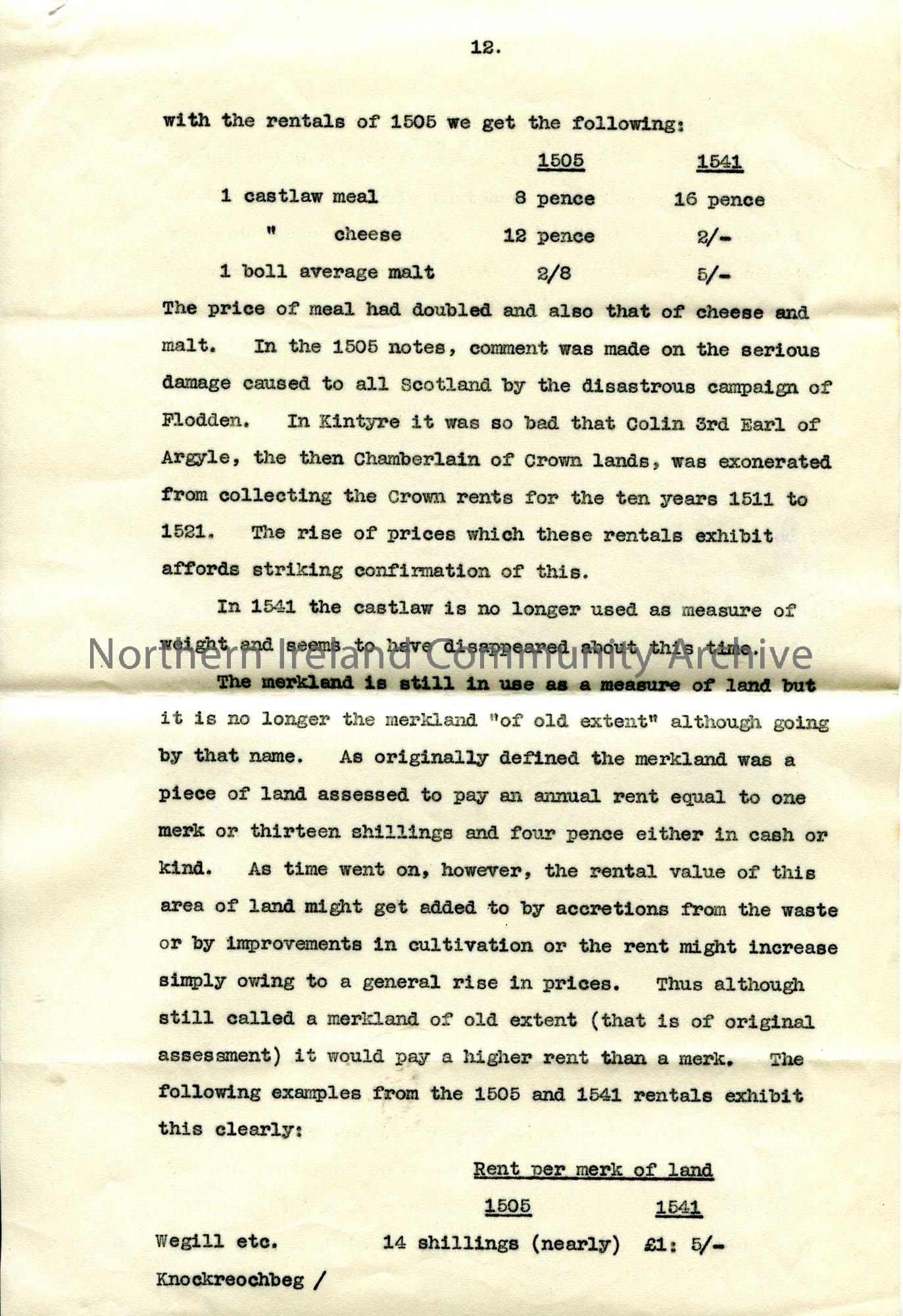 Page 4 of 5. Typed notes re MacFarlane's of Scotland and cost of land rent in 16th century Scotland. [CM:2018:564 states that Sam wrote an article re the MacFarlane's for a 'Coleraine paper'].