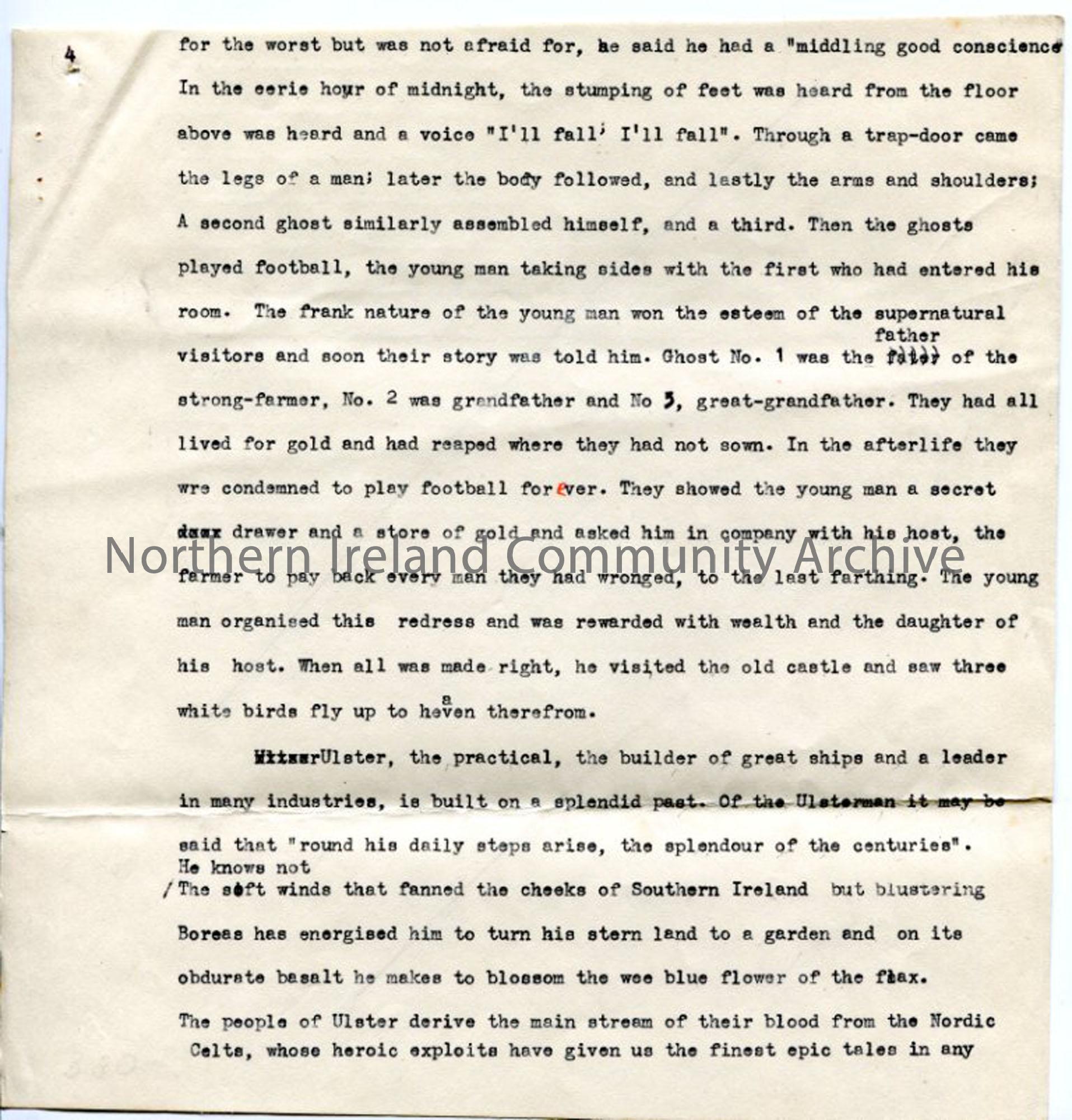 Page 4 of 6 typed pages of script for the broadcast 'Old Customs and Legends of Ulster', sent out across USA and Canada - folklore stories, saints, cures for disease, traditional practices.