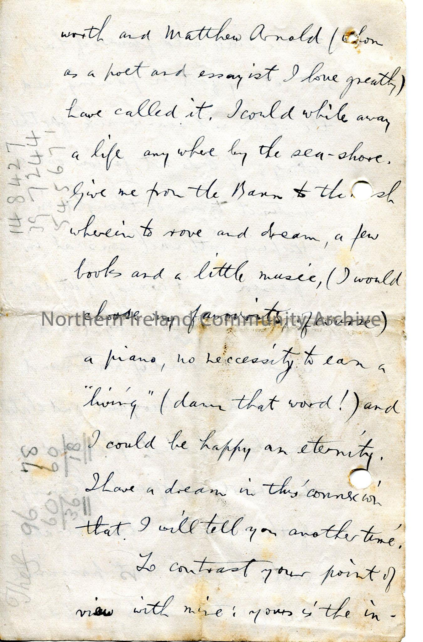 Page 4 of 6 page handwritten letter, on both sides of paper. Discusses his working hours, then a love of nature shared with Sam - elaborates, describing walks e.g. from Cranagh to Barmouth and the sights and sounds along the way