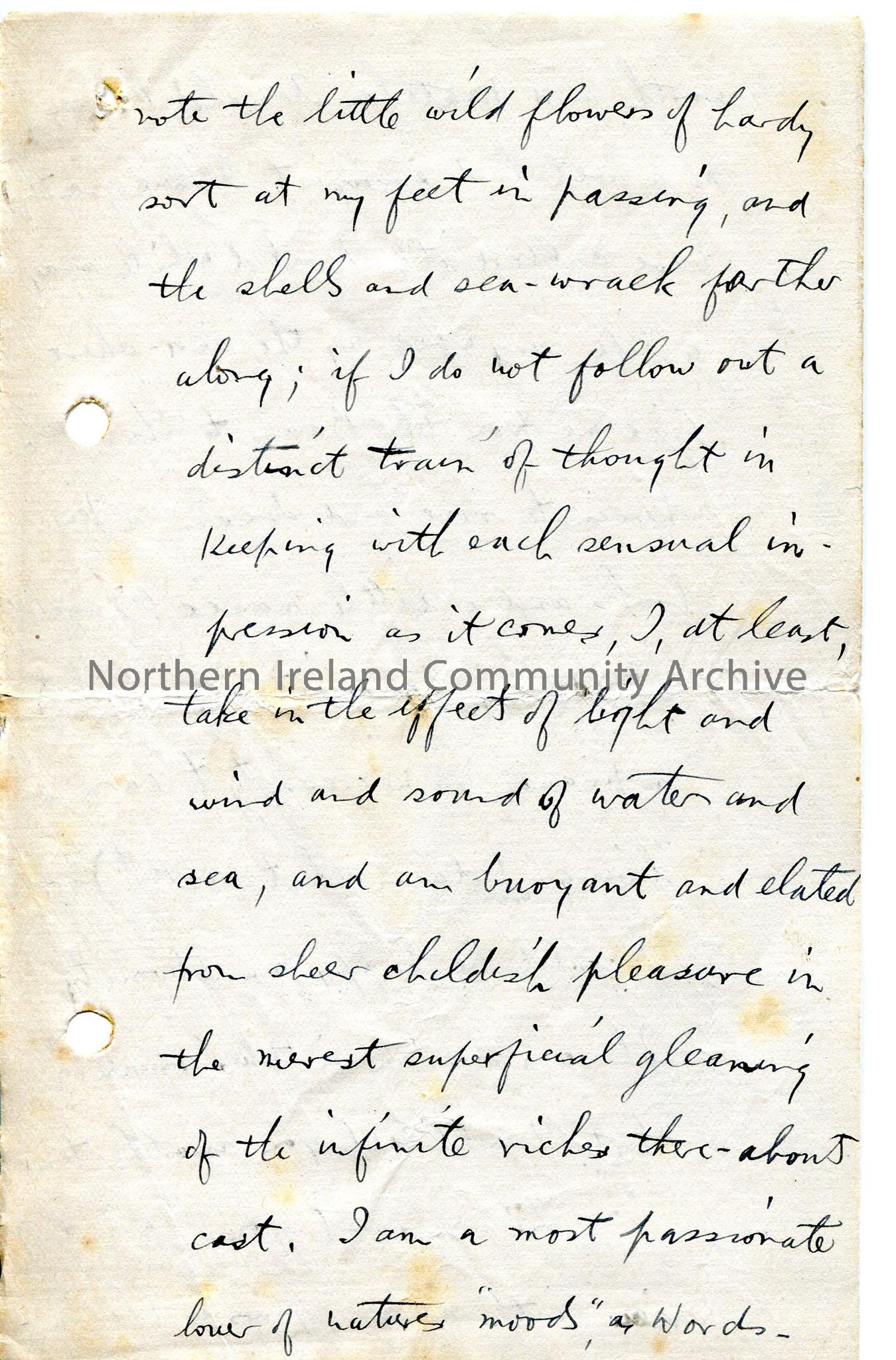 Page 4 of 6 page handwritten letter, on both sides of paper. Discusses his working hours, then a love of nature shared with Sam - elaborates, describing walks e.g. from Cranagh to Barmouth and the sights and sounds along the way