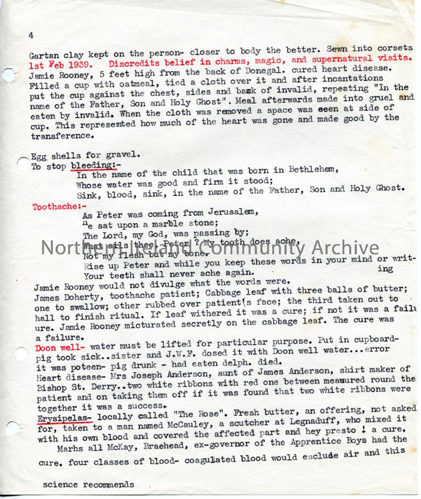 Page 4 of 7 typed pages under heading of 'Commonplace Book of J W Foster'. Contains sections on: Ulster Dialect, with definitions of words ; traditional practices/ cures for ills, with their attributed origins; folklore and ghost stories. Dated 17th April 1943.