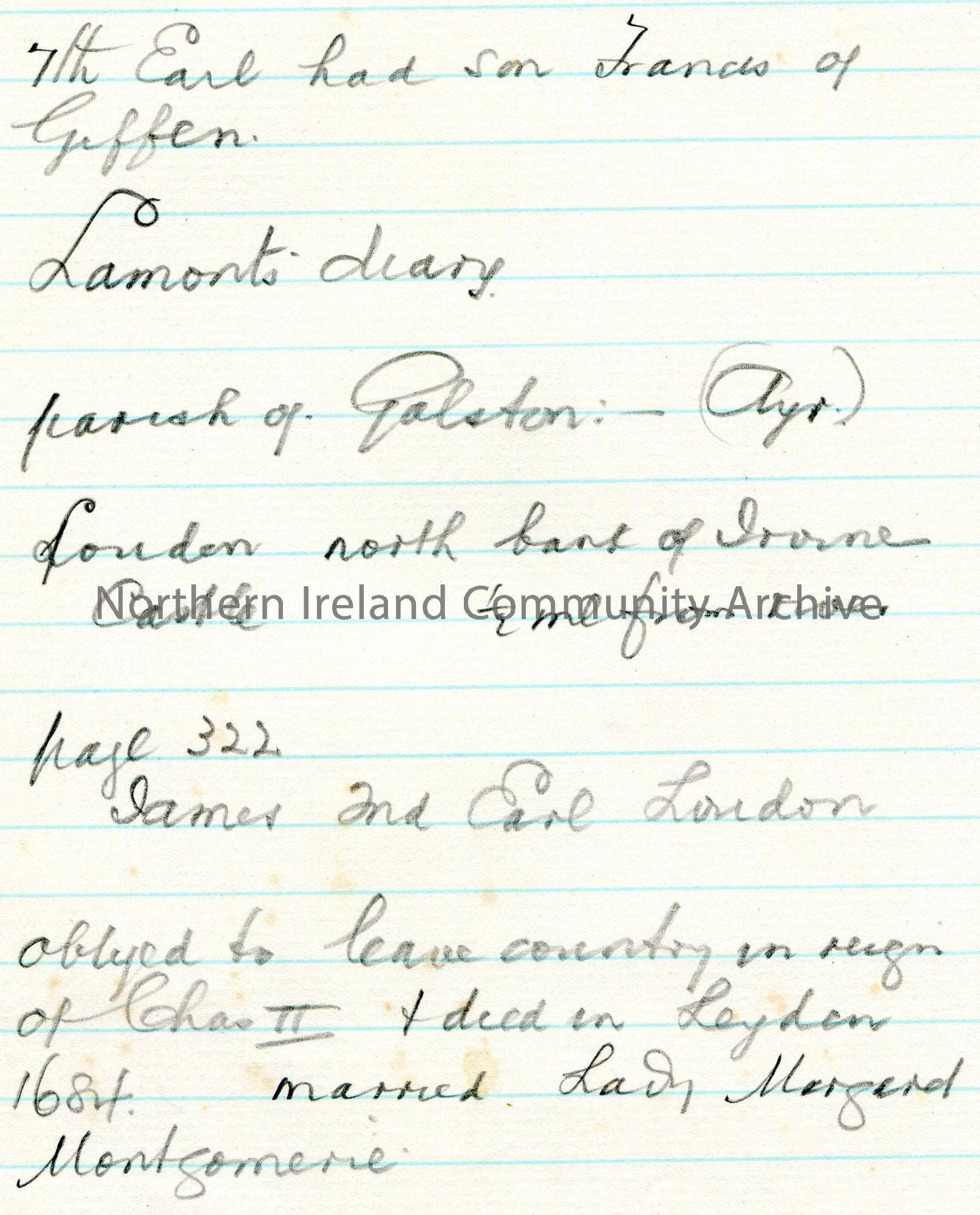 Page 4 of 7. Handwritten notes in pencil on lined paper. Not in context. Re surnames O’Neill, McDonald, O’Kane; harp.