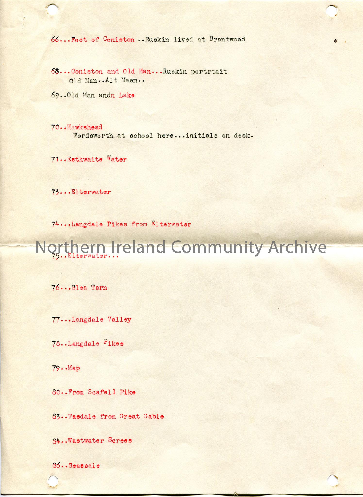 Page 4 of 7 of typed notes re lecture titled, 'The English Lakes' at Portrush on 15th February 1935. Typed list on first 5 pages of 96 topics which appear to be mostly places.