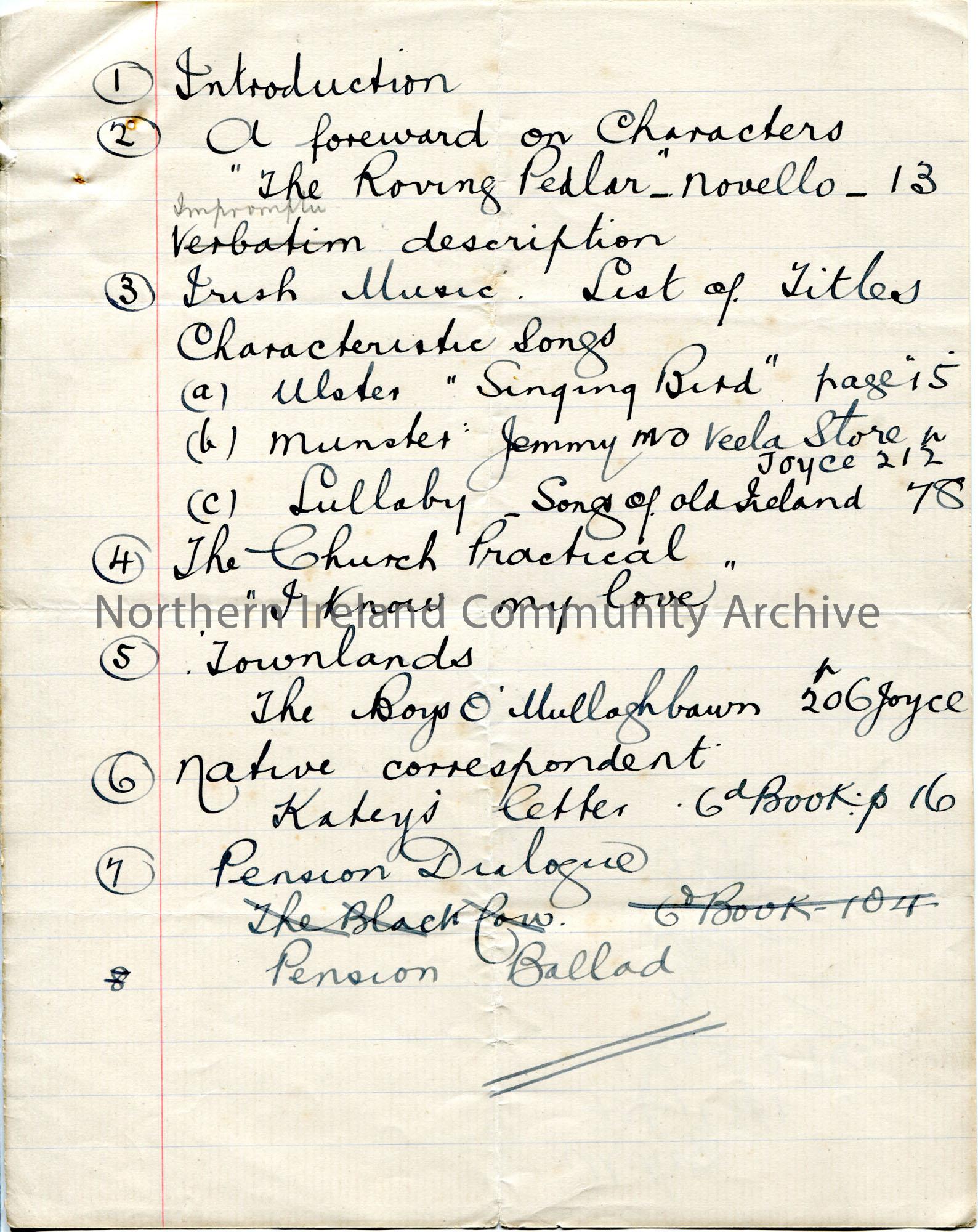 Page 4 of 8. Handwritten notes as part of several pages for an evening of entertainment by Sam Henry at the meeting of New Row Association on 7th February 1911. Titled, 'An Irish Miscellany'. Re characters Sam has met in various parts of Ireland - Jane Kerr, John Taggart, Bernard O'Neill, John Wright, Francis McDonald, Katie Fullan, John Gartland, Sarah Agnew, John Ryan . Includes an itinerary of the evening performance.